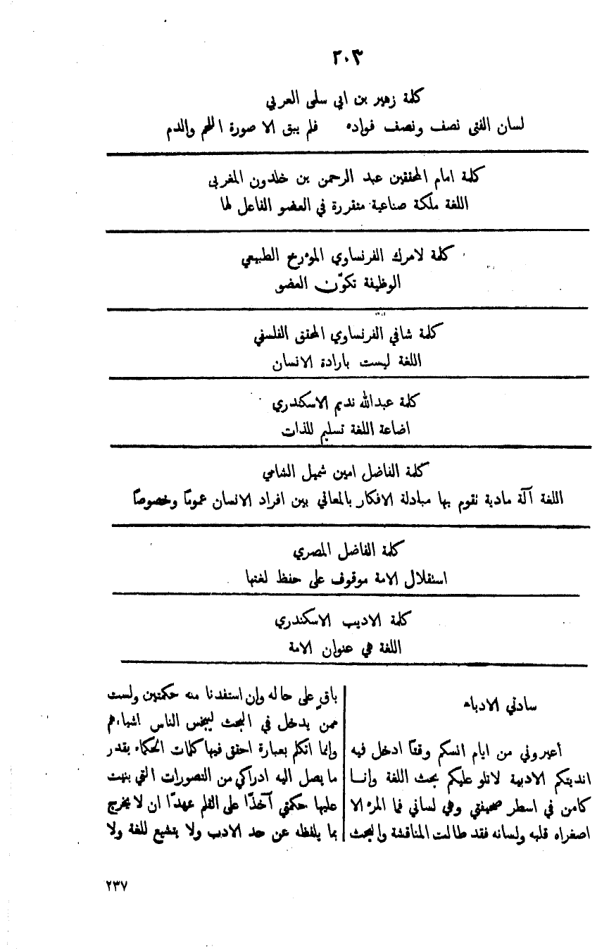 أعيروني من أيام أنسكم وقتاً ادخل فيه أنديتكم الأدبية لاتلو عليكم بحث اللغة وأنا كامن في اسطر صحيفتي وهي لساني فما المرء الا أصغراه قلبه ولسانه فقد طالت المناقشة والبحث باق على حاله وإن استفدنا منه حكمتين وليست ممن يدخل في البحث ليبخس الناس أشياءهم وإنما أتكلم بعبارة أحقق فيها كلمات الحكماء بقدر ما يصل إليه إدراكي من
