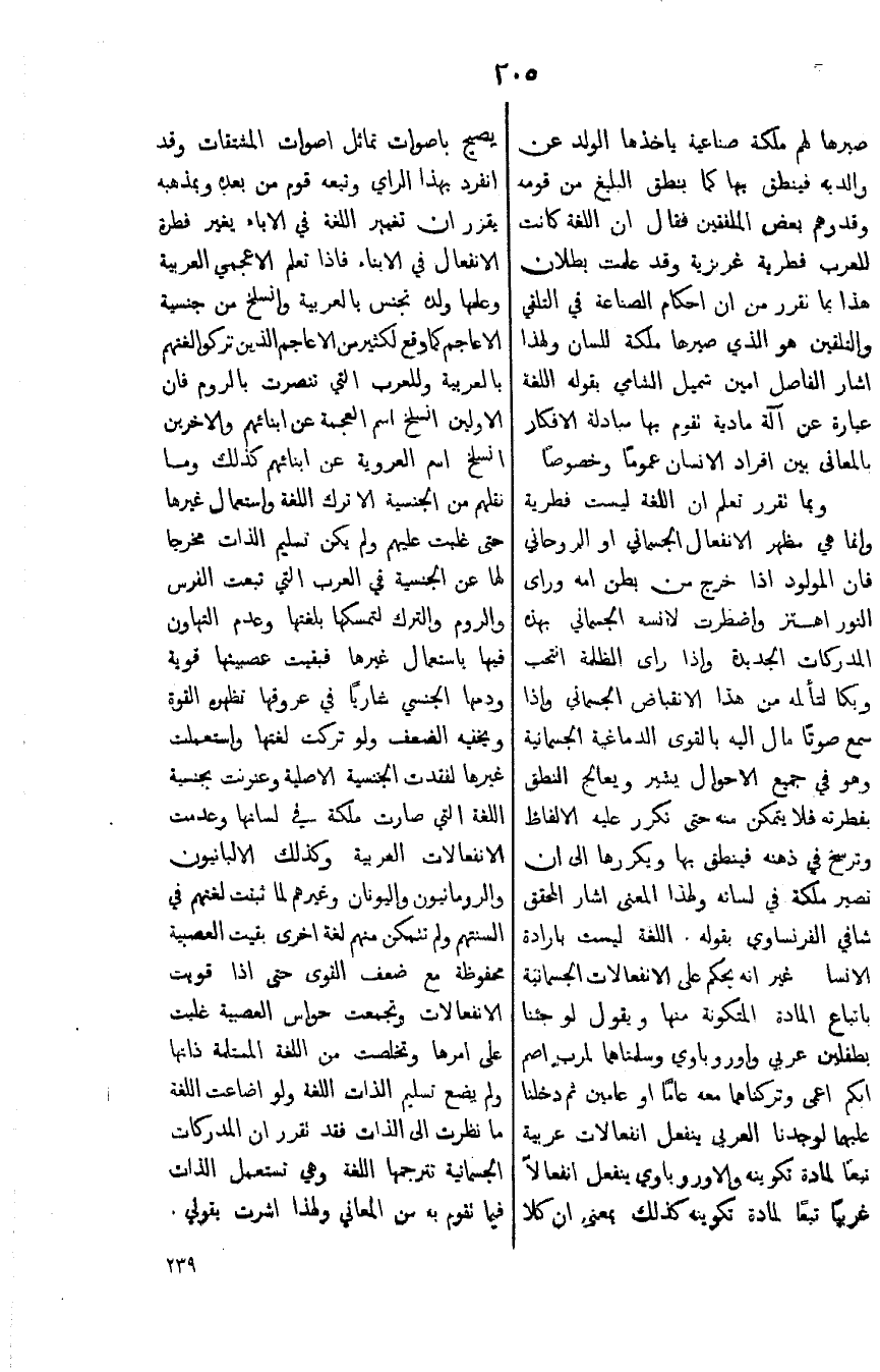 الجنسية في العرب التي تبعت الفرس والروم والترك لتمسكها بلغتها وعدم التهاون فيها باستعمال غيرها فبقيت عصبتها قوية ودمها الجنسي ساربا في عروقها تظهره القوة ويخفيه الضعف ولو تركت لغتها واستعملت غيرها لفقدت الجنسية الأصلية وعنونت بجنسية اللغة التي صارت ملكة في لسانها وعدمت الانفعالات العربية وكذلك الالبانيون والرومانيون واليونانيون وغيرهم لما ثبت لغتهم في ألسنتم ولم تنمكن منهم لغة أخرى بقيت العصبية محفوظة مع ضعف القوى حتى اذا قويت الانفعالات وتجمعت حواس العصبية غلبت على أمرها وتخلصت من اللغة المستلمة ذاتها ولم بضع تسليم الذات اللغة ولو أضاعت اللغة ما نظرت الى الذات فقد نقرر إن المدركات الجسمانية نترجمها اللغة وهي تستعمل الذات فيما نقوم به من المعاني وهذا أشرت بقولي.