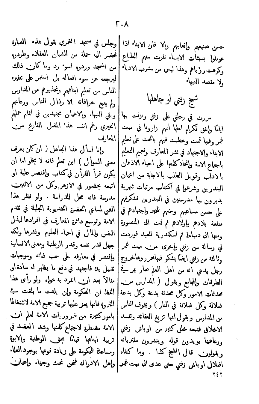 مررت في رحلتي على زفتي ونزلت بها أياما واتفق لكرام أهلها أنهم زارونا في ميت غمر وفيها قمت وخطبت فيهم بالحث على تعليم الابناء والاجتهاد في نشر المعارف وتعميم التعليم باجتماع واتحاد كلمتها على إحياء الأذهان بالآداب وقوبل الطلب بالإجابة من أعيان البندرين وشرعوا اكتتاب مرتبا شهرية يديرون بها مدرستين البندرين فشكرتهم على حسن مساعيهم وحبهم للخير واجتهادهم في منفعة بلادهم وأولادهم ثم قمت الى المنصورة ومنها الى دمياط ثم إسكندرية للعيد فوردت لي رسالة من زفتي وأخرى من ميت غمر وثالثة من زفتي أيضا يشكو فيها محرر وها خروج رجل يدعى انه من اهل العلم صار يمر في الطرقات والمجامع ويقول (المدارس من محدثات الأمور وكل محدثة بدعة ضلالة في النار) ويخوف الناس من المدارس ويقول أنها تزيغ العقائد وتفسد الاخلاق فتبعه خلق كثير من أوباش زفتي ورعاعها يويدون قوله وينشرون مفترياته ويقولون قال الشيخ كذالك وما كفاه إضلال او باش زفتي حتى عدى الى ميت غمر وجلس في مسجد الغمري يقول هذه العبارة فحضر إليه جملة من الشبان العقلاء وطردوه من المسجد ورده أسوء رد وما كان ذلك ليرجعه عن سوء أفعاله بل استمر على تنفيره الناس من تعليم أبنائهم وتحذيرهم من المدارس ولم يتبع خرافاته الا رذال الناس وراعهم وبقي النبهاء والأعيان مجتهدين في إتمام عملهم الخيري رغم انف هذا المضل الفارغ من المعارف.
