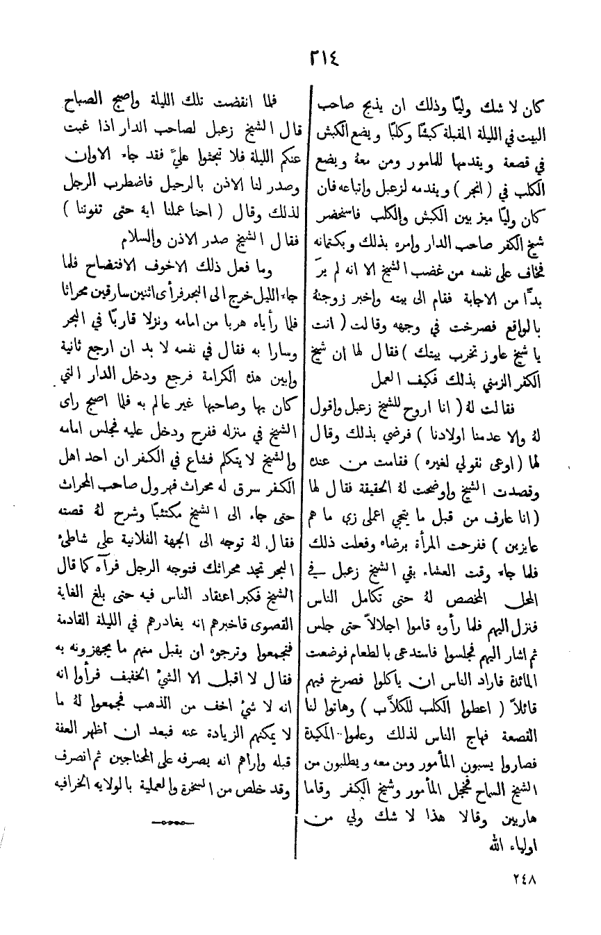 عارف من قبل ما يتحبي اعملى زي ما هم عايزين) ففرحت المرأة برضاه وفعلت ذلك فلما جاء وقت العشاء بقي الشيخ زعبل في الحل المخصص له حتى تكامل الناس فنزل أليهم فلما رأوه قاموا أجلالا حتى جلس ثم أشار أليهم فجلسوا فاستعدعى بالطعام فوضعت المائدة فاراد الناس ان يأكلوا فصرخ فيهم قائلا (أعطوا الكلب للكلاب) وهاتوا لنا القصعة فهاج الناس لذلك وعملوا المكيدة فصاروا يسبون المأمور ومن معه ويطلبون من الشيخ السماح فخجل المأمور والشيخ وقاما هاربين وقالا هذا لا شك ولي من أولياء الله فلما انقضت تلك الليلة واصبح الصباح قال الشيخ زعبل لصاحب الدار اذا غبت عنكم الليلة فلا تبحثوا علي فقد جاء الأوان وصدر لنا الأذن بالرحيل فاضطرب الرجل لذلك (أحنا عملنا أية حتى تفوتنا) فقال الشيخ صدر الأذن والسلام