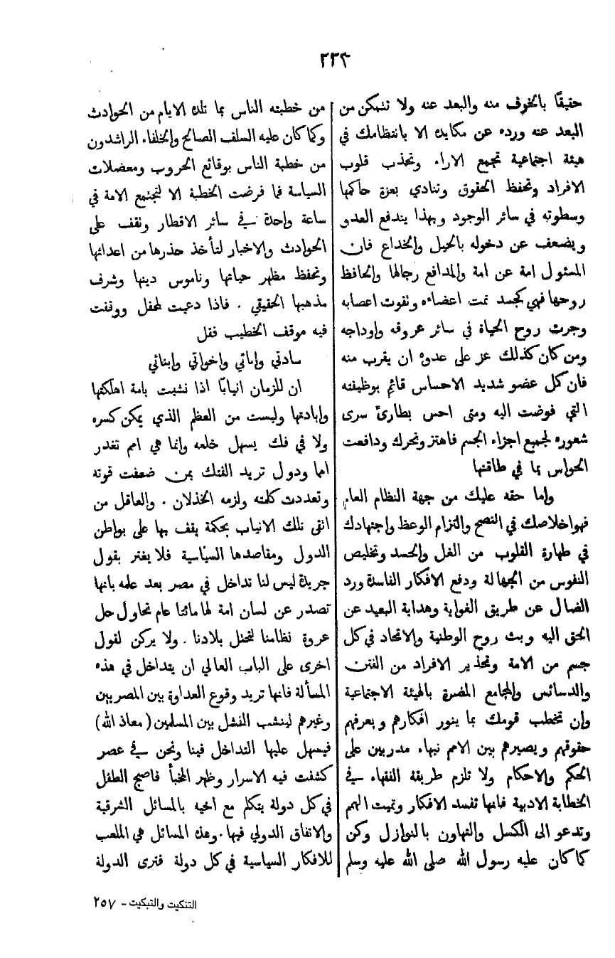 جسم من الامة وتحذير الافراد من الفتن والدسائس والمجامع المضرة بالهيئة الاجتماعية وان تخطب قومك بما ينور افكارهم ويعرفهم حقوقهم ويصيرهم بين الامم نبهاء مدربين على الحكم والاحكام ولا تلزم طريقة الفقهاء في الخطابة الادبية فانها تفسد الافكار وتميت الهمم وتدعو الى الكسل والتهاون بالنوازل وكن كما كان عليه رسول الله صلى الله عليه وسلم من خطبته الناس بما تلده الايام من الحوادث وكما كان عليه السلف الصالح والخلفاء الراشدون من خطبة الناس بوقائع الحروب ومعضلات السياسة فما فرضت الخطبة الا لتجمع الامة في ساعة واحدة في سائر الاقطار وتقف على الحوادث والاخبار لتأخذ حذرها من اعدائها وتحفظ مظهر حياتها وناموس دينها وشرف مذهبها الحقيقي. فاذا دعيت لمحفل ووقفت فيه موقف الخطيب فقل