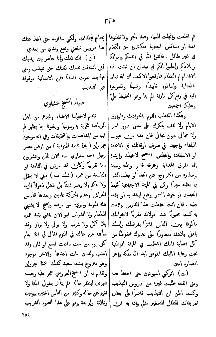 وهكذا اتخطب القوم بالحوادث وطوارق الايام ولا تقف بفكرك على معنى دون اخر ولا مجال دون مجال فان هذا من عيوب البلغاء واجهد في صرف اوقاتك في الافادة او الاستفادة واخلص النصح لاخيك وارشده الى طرق الهداية وعرفه قدر وطنه وسيده وحذره من الخروج عن الحد او جلب الشر بما يظنه خيراً وكن في الهيئة الاجتماعية كخيط الحصير او عود السمر يوضع ليشد به او يشد عليه. فان انت حفظت هذا الدرس وعملت به كنت محبوباً عند مولاك مقرباً لاخوانك مألوفاً بين الناس فائزاً بغرضك وامنك باهل بلادك منصوراً على عدوك محفوظاً من كل اصابة فانك انتظمت في الهيئة الوطنية تحت رعاية المليك الموفق ابد الله ملكه واعز انصاره امين