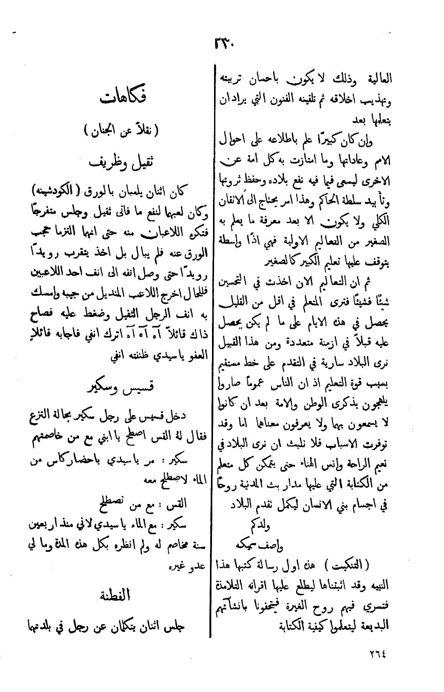 ثم ان التعاليم الان اخذت في التحسين شيئاً فشيئاً فترى المتعلم في اقل من القليل يحصل في هذه الايام على ما لم يكن يحصل عليه قبلاً في ازمنة متعددة ومن هذا القبيل نرى البلاد سارية في التقدم على خط مستقيم بسبب قوة التعليم اذ ان الناس عموماً صاروا ملهجون بذكرى الوطن والامة بعد ان كانوا لا يسمعون بهما ولا يعرفون معناها اما وقد توفرت الاسباب فلا نلب ثان نرى البلاد في نعيم الراحة وانس الهناء حتى يتمكن كل متعلم من الكتابة التي عليها مدار بث المدنية روحاً في اجسام بني الانسان ليكمل تقدم البلاد