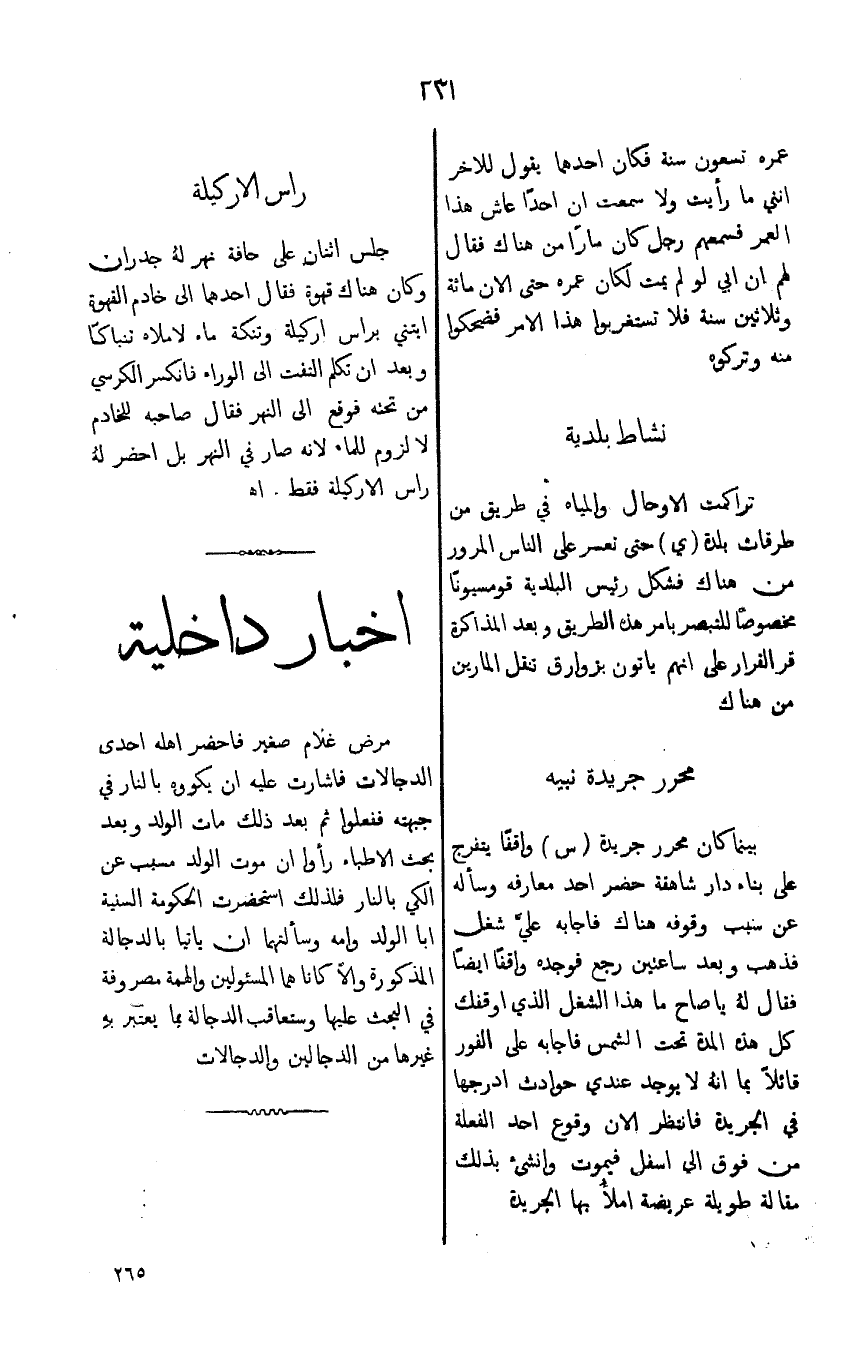 تراكمت الاوجال والمياه في طريق من طرقات بلدة (ي) حتى تعسر على الناس المرور من هناك فشكل رئيس البلدية قومسيوناً مخصوصاً للتبصر بامر هذه الطريق وبعد المذاكرة قر القرار على انهم ياتون بزوارق تنقل المارين من هناك