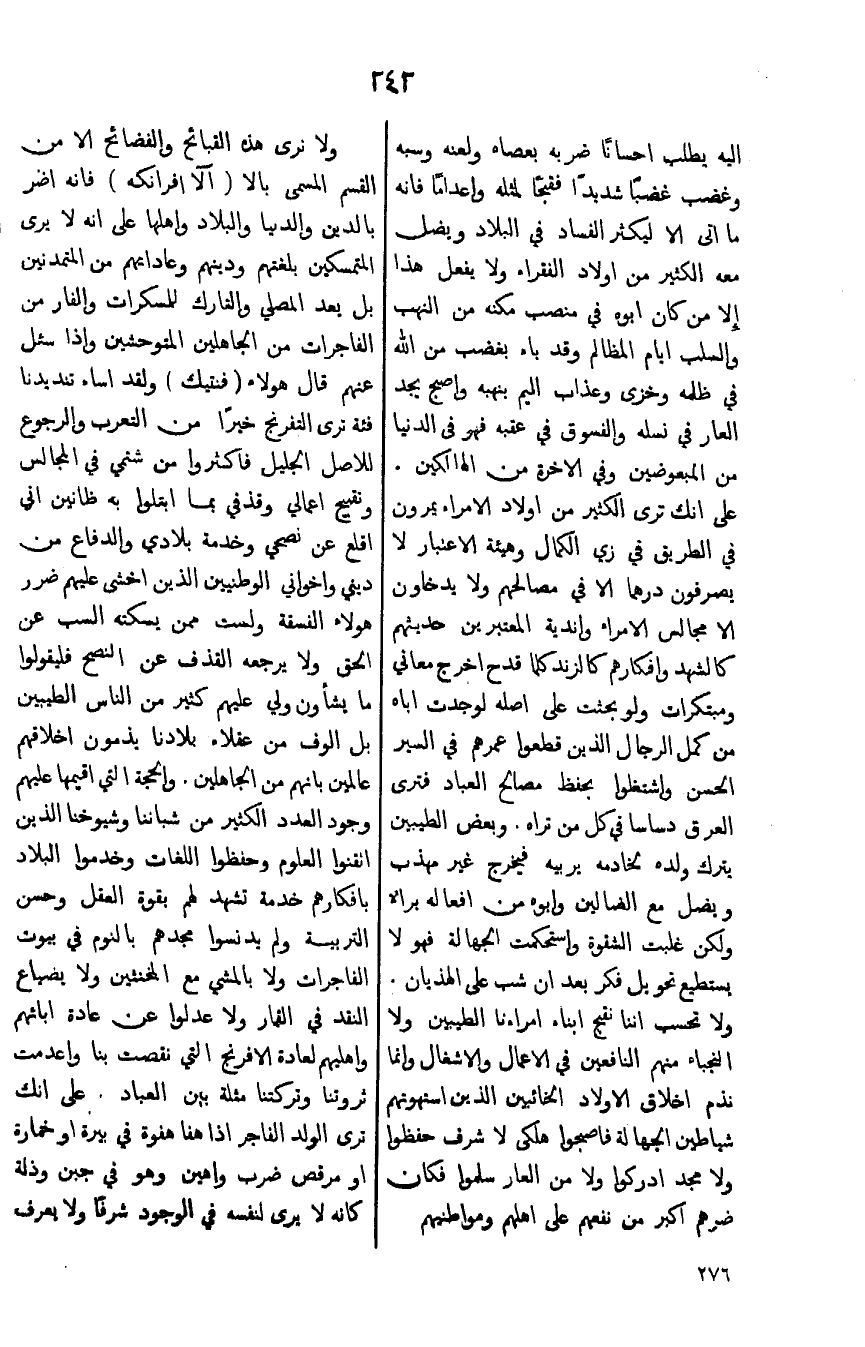 ولا تحسب اننا نقبح ابناء امراءنا الطيبين ولا النجباء منهم النافعين في الاعمال والاشغال وانما نذم اخلاق الاولاد الخائبين الذين استهوتهم شياطين الجهالة فاصبحوا هلكى لا شرف حفظوا ولا مجد ادركوا ولا من العار سلموا فكان ضرهم اكبر من نفعهم على اهلهم ومواطنيهم ولا نرى هذه القبائح والفضائح الا من القسم المسمى بالا (آلا افرانكه) فانه اضر بالدين والدنيا والبلاد واهلها على انه لا يرى المتمسكين بلغتهم ودينهم وعاداتهم من المتمدين بل يعد المصلي والتارك للمسكرات والفار من الفاجرات من الجاهلين المتوحشين واذا سئل عنهم قال هؤلاء (فنتيك) ولقد اساء تنديدنا فئة ترى التفريخ خيراً من التعرب والرجوع للاصل الجليل فاكثروا من شتمي في المجالس وتقبيح اعمالي وقذفي بما ابتلوا به ظانين اني اقلع عن نصحي وخدمة بلادي والدفاع من ديني واخواني الوطنيين الذين اخشى عليهم ضرر هؤلاء الفسفة ولست ممن يسكته السب عن الحق ولا يرجعه القذف عن النصح فليقولوا ما يشأون ولي عليهم كثير من الناس الطيبين بل الوف من عقلاء بلادنا يذمون اخلاقهم عالمين بانهم من الجاهلين. والحجة التي اقيمها عليهم وجود العدد الكثير من شبابنا وشيوخنا الذين اتقنوا العلوم وحفظوا اللغات وخدموا البلاد بافكارهم خدمة تشهد لهم بقوة العقل وحسن التربية ولم يدنسوا مجدهم بالنوم في بيوت الفاجرات ولا بالمشي مع المخنثين ولا يضاع النقد في القمار ولا عدلوا عن عادة ابائهم واهليهم لعادة الافرنج التي