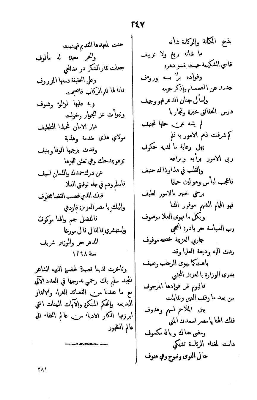 وتاخرت لدينا قصيدة لحضرة النبيه الشاعر المجيد سليم بك رحمي ندرجها في العدد الاتي