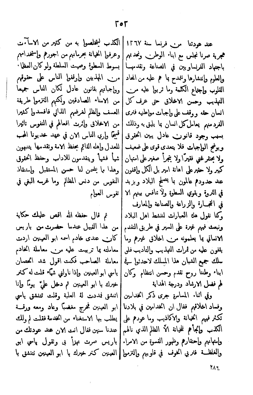 وفي اثناء المسامرة جرى ذكر الخدامين وفساد اخلاقهم فقال ان الخدامين في بلادنا تكثر فيهم الخيانة والاكاذيب وما عودهم على الكذب والجأهم للخيانة الا الظلم الذي نالهم وامتهانهم واحتقارهم وطهور القسوة من الامراء والغلظة فتربي الخوف في قلوبهم والتزموا الكذب ليتخلصوا به من كثير من الاسآءت وعرفوا الخيانة بحرمانهم من اجورهم واستخدامهم بسوط السطوة وصيت السلطة ولو كان العظما. من المهذبين واوقفوا الناس على حقوقهم وواجباتهم بقانون عادل لكان الناس جميعا من الامناء الصادقين ولكنهم التزموا طريقة العسف والظلم لغرضهم الذاتي فافسدوا في النفوس تاثيرا قبيحاً واري الناس الان في عهد خديوناالمحب للعدل واهله القائم بحفظ الامة وتقدمها يتنبهون شيأ فشيأ ويتقدمون