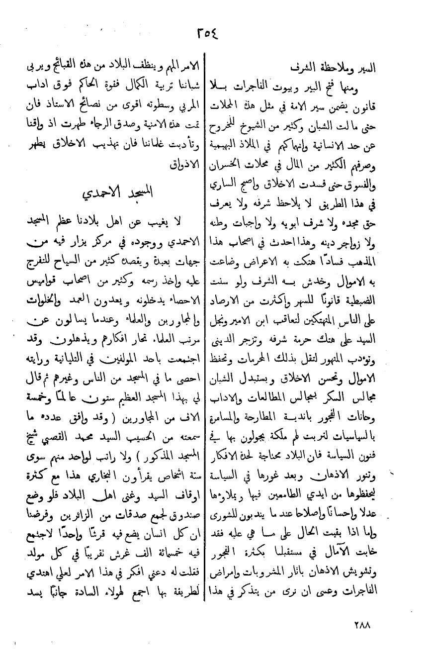 ومنها فتح البير وبيوت الفاجرات بلا قانون يضمن سير الامة في مثل هذه المحلات حتى مالت الشبان وكثير من الشيوخ للخروج عن حد الانسانية وانهماكهم في الملاذ البهيمية وصرفهم الكثير من المال في محلات الخسران والفسوق حتى فسدت الاخلاق واصبح الساري في هذا الطريق لا يلاحظ شرفه ولا يعرف حق مجده ولا شرف ابويه ولا واجبات وطنه ولا زواجر دينه وهذا احدث في اصحاب هذا المذهب فساداً هتكت به الاعراض وضاعت به الاموال وخدش به الشرف ولو سنت الضبيطة قانوناً للسهر واكثرت من الارصاد على الناس المنهتكين لنعاقب ابن الامير ونجل السيد على هتك حرمة شرفه وتزجر الديني وتؤدب المتهور لتقل بذلك المحرمات وتحفظ الاموال وتحسن الاخلاق ويستبدل الشبان مجالس السكر بمجالس المطالعات والاداب وحانات الفجور باندية المطارحة والمسامرة بالسياسيات لتربت لهم ملكه يجولون بها في فتون السياسة فان البلاد محتاجة لحدة الافكار وتنور الاذهان وبعد غورها في السياسة ليحفظوها من ايدي الطامعين فيها ويملاؤها عدلا واحساناً واصلاحا عندما يندبون للشورى واما اذا بقيت الحال على ما هي عليه فقد خابت الآمال في مستقبلنا بكثرة الفجور وتشويش الاذهان باثار المشروبات