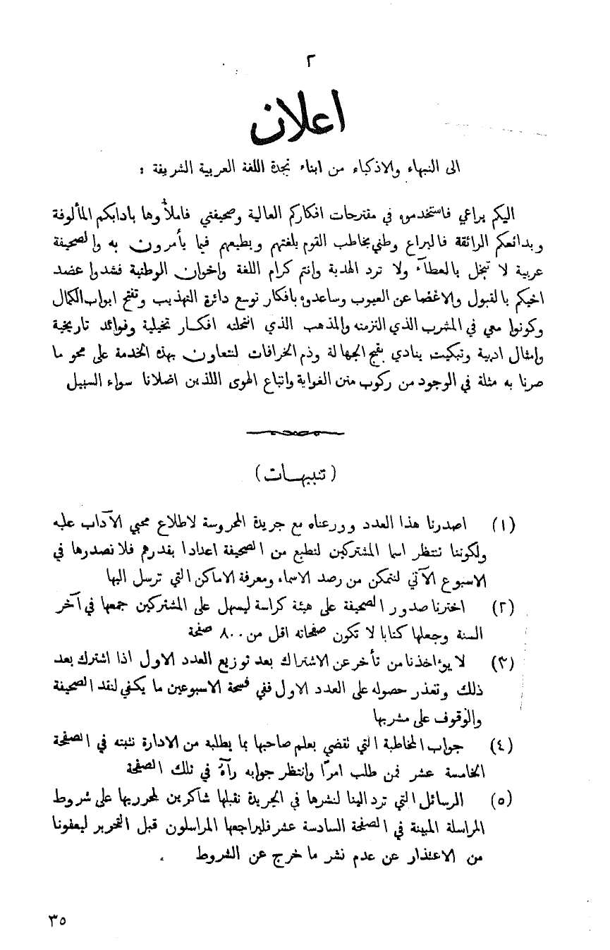 5 - الرسائل التي ترد إلينا لنشرها في الجريدة نقبلها شاكرين لمحرريها على شروط المراسلة المبينة في الصفحة السادس عشر فليراجعها المراسلون قبل التحرير ليعفونا من الاعتذار عن عدم نشر ما خرج عن الشروط.