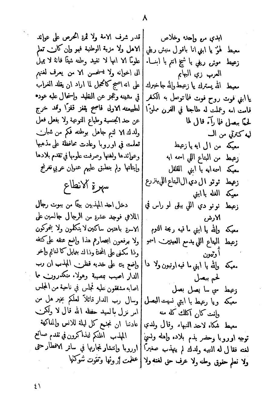 معيط شكاه لأحد النبهاء وقال ولدي توجه أوروبا وحضر يذم بلاده وأهله ونسي لغته فقال له النبيه ولدك لهم يتهذب صغيراً ولا تعلم حقوق وطنه ولا عرف حق لغته ولا قدر شرف الأمة ولا ثمرة الحرص على عوائد الأهل ولا مزية الوطنية فهو وإن كان تعلم علوماً إلا أنها لا تفيد وطنه شيئاً فإنه لا يميل إلى إخوانه ولا يستحسن إلا من يعرف لغتهم على أنه أصبح كالحجل لما أراد أن يقلد الغراب في مشيته وعجز عن التقليد واستحال عليه عوده لطبيعته الأولى فأصبح يقفز قفزاً وقد خرج عن حد الجنسية وطباع النوعية ولا يفعل فهل ولدك إلا اللئيم جاهل بوطنه فكم من شبان تعلمت في أوروبا وعادت محافظة على مذهبها وعوائدها ولغتها وصرفت علومها في تقدم بلادها وأبنائها ولم ينطبق عليهم عنوان عربي تفرنج.