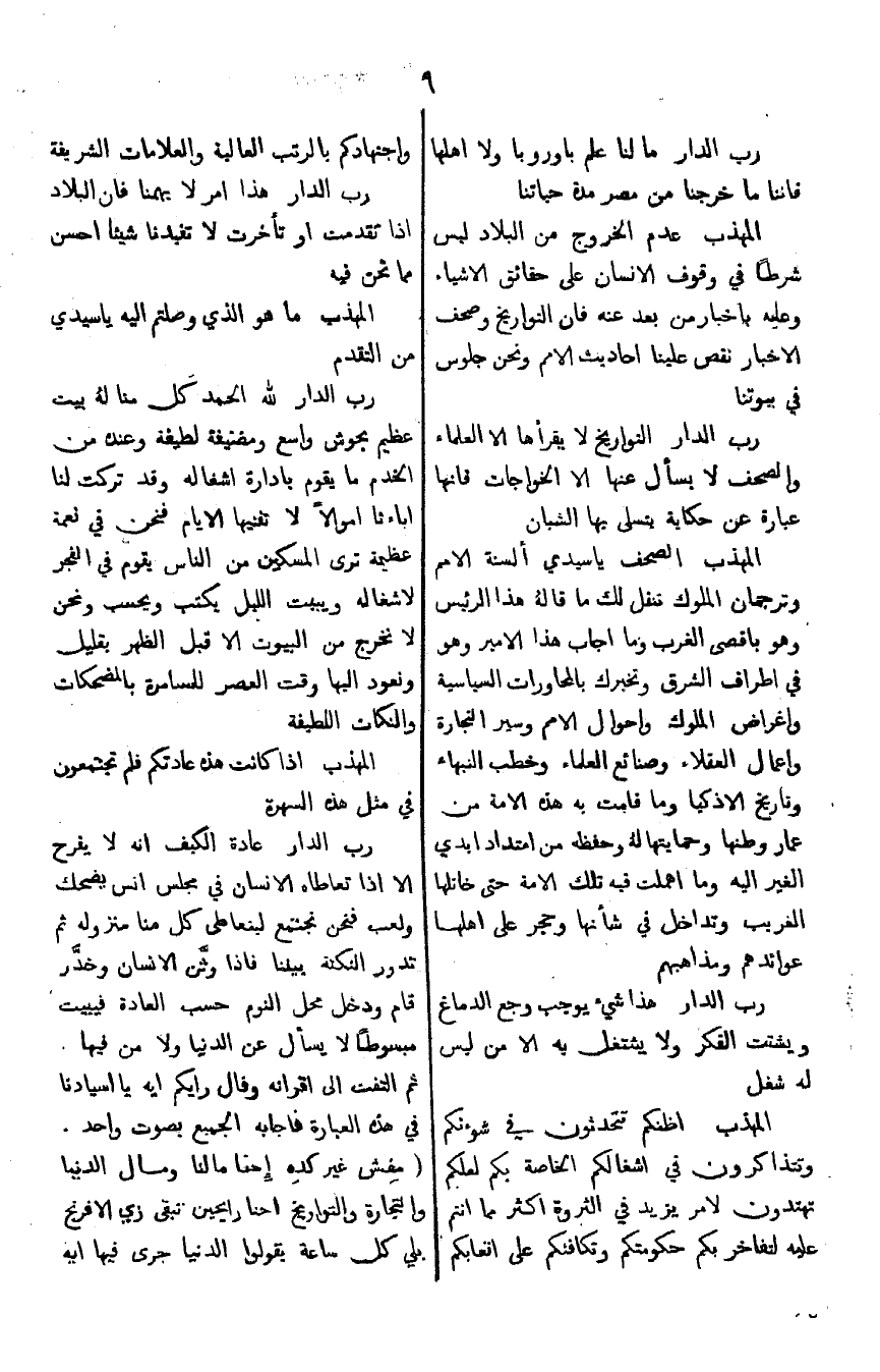 المهذب: الصحف يا سيدي ألسنة الأمم وترجمان الملوك تنقل لك ما قاله هذا الرئيس وهو بأقصى الغرب وما أجاب هذا الأمير وهو في أطراف الشرق وتخبرك بالمحاورات السياسية وأغراض الملوك وأحوال الأمم وسير التجارة وأعمال العقلاء وصنائع العلماء وخطب النبهاء وتاريخ الأذكياء وما قامت به هذه الأمة من عمار وطنها وحمايتها له وحفظه من امتداد أيدي الغير إليه وما أهملت فيه تلك الأمة حتى خاتلها الغريب وتداخل في شأنها وحجر على أهلها عوائدهم ومذاهبهم.