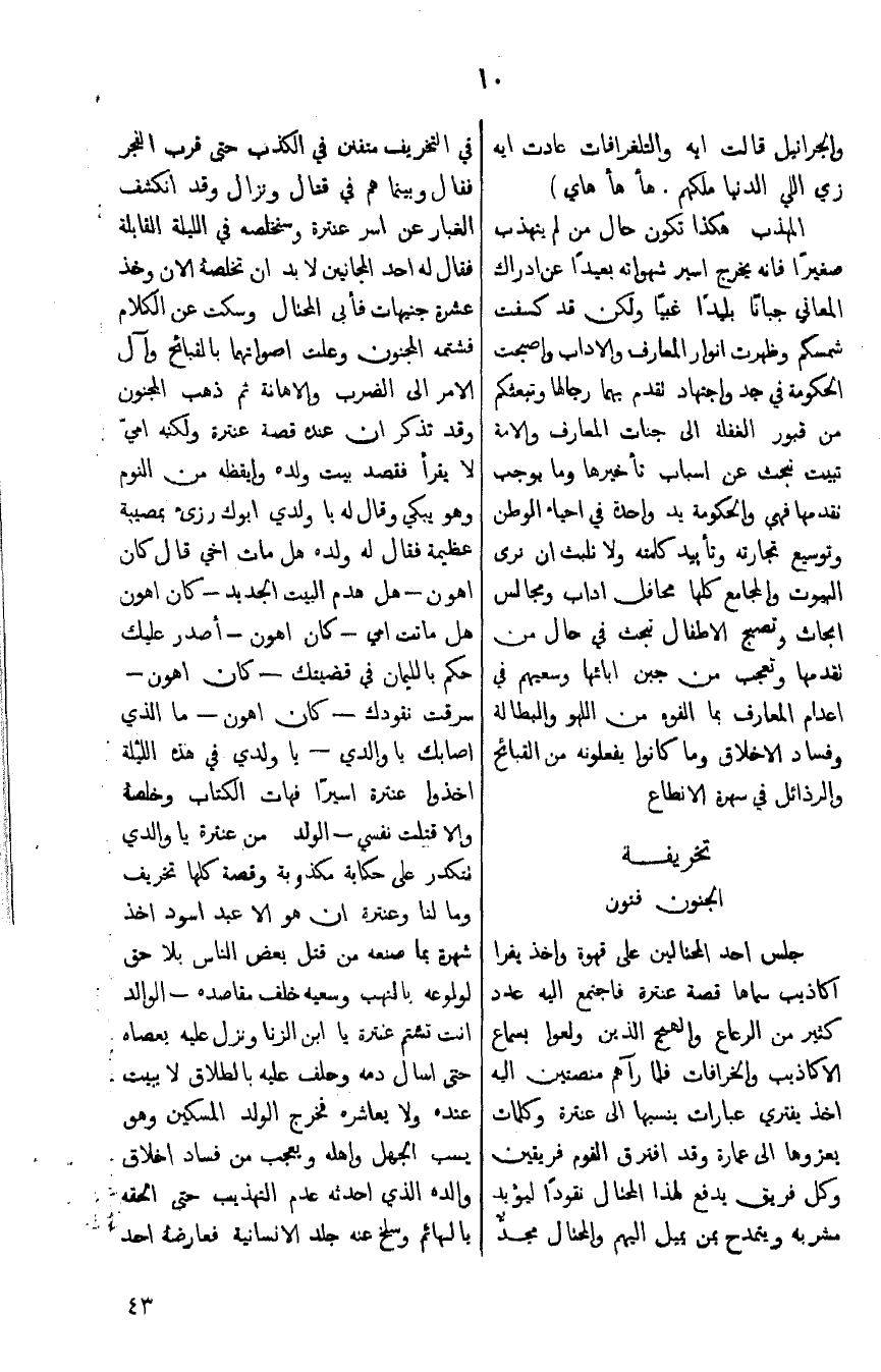 جلس أحد المحتالين على قهوة وأخذ يقرأ أكاذيب سماها قصة عنترة فاجتمع إليه عدد كثير من الرعاع والهمج الذين ولعوا بسماع الأكاذيب والخرافات فلما رآهم منصتين إليه أخذ يفتري عبارات ينسبها إلى عنترة وكلمات يعزوها إلى عمارة وقد افترق القوم فريقين وكل فريق يدفع لهذا المحتال نقوداً ليؤيد مشربه ويتمدح بمن يميل إليه والمحتال مجدٌّ في التخريف متفنن في الكذب حتى قرب الفجر فقال وبينما هم في قتال ونزال وقد انكشف الغبار عن أسر عنترة وسنخلصه في الليلة القابلة فقال له أحد المجانين لابد أن تخلصه الآن وخذ عشرة جنيهات وعلت أصواتهما بالقبائح وآل الأمر إلى الضرب والإهانة ثم ذهب المجنون وقد تذكر أن عنده قصة عنترة ولكنه أميّ لا يقرأ فقصد بيت ولده وأيقظه من النوم وهو يبكي وقال له يا ولدي أبوك رزئ بمصيبة عظيمة فقال له ولده هل مات أخي قال كان أهون ـ هل هدم البيت الجديد ـ كان أهون هل ماتت أمي ـ كان أهون ـ أصدر عليك حكم بالليمان في قضيتك ـ كان أهون ـ سرقت نقودك ـ كان أهون ـ ما الذي أصابك يا والدي ـ يا ولدي في هذه الليلة أخذوا عنترة أسيراً فهات الكتاب وخلصه وإلا قتلت نفسي ـ الولد: من عنترة يا والدي تتكدر على حكاية مكذوبة وقصة كلها تخريف وما لنا وعنترة إن هو إلا عبد أسود أخذ شهرة بما صنعه من قتل بعض الناس بلا حق لولوعه بالنهب وسعيه خلف مقاصده ـ الوالد: أنت تشتم عنترة يا ابن الزنا ونزل عليه بعصاه حتى أسال دمه وحلف عليه بالطلاق لا يبيت عنده ولا يعاشره فخرج الولد المسكين وهو يسب الجهل وأهله ويعجب من فساد أخلاق والده الذي أحدثه عدم التهذيب حتى ألحقه بالبهائم وسلخ عنه جلد الإنسانية فعارضه أحد
