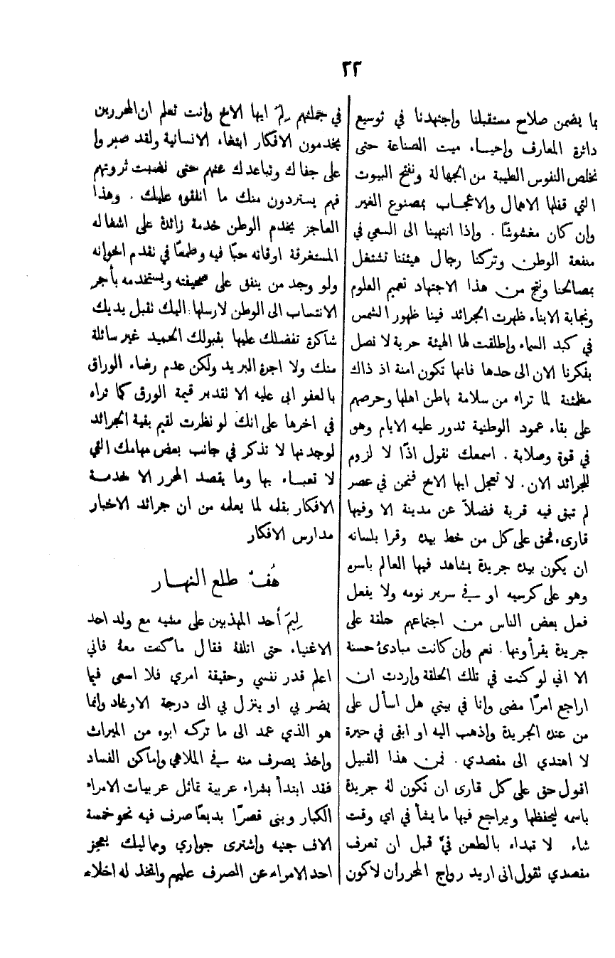 واحياء ميت الصناعة حتى نخلص النفوس الطيبة من الجهاله ونفتح البيوت التي قفلها الاهمال والاعجاب لمصنوع الغير وان كان مغشوشا. واذا انتهينا الى السعي في منفعة الوطن وتركنا رجال هيئتنا تشغل بمصالحنا ونتج من هذا الاجتهاد تعميم العموم ونجابة الابناء ظهرت الجرائد فينا ظهور الشمس في كبد السماء واطلقت لها الهيئه حريه لا نصل بفكرنا الان الى حدها فانها تكون امنه اذ ذاك مطمئنه لما تراه من سلامة باطن اهلها وحرصهم على بقاء عمود الوطنيه تدور عليه الايام وهو في قوة وصلابة. اسمعك تقول اذا لا لزوم لجرائد الان. لا تعجين ايها الاخ فنحن في عصر لن تبقى فيه قريه فضلا عن مدينة الا وفيها قارئ فحق على كل من خط بيده وقرأ بلسانه ان يكون بيده جريدة يشاهد فيها العالم باسره وهو على كرسيه او في سرير نومه ولا يفعل فعل بعض الناس من اجتماعهم حلقه على جريده يقرأنها. نعم وان كانت مبادى حسنة الا اني لو كنت في تلك الحلقه واردت ان اراجع امرا مضى وانا في بيتي هل اسأل على من عنده الجريدة واذهب اليه او ابقى في حيرة لا اهتدي الى مقصدي. فمن هذا القبيل اقول حق على قارى ان تكون له جريدة باسمه ليحفظها ويراجع فيها ما يشأ في أي وقت شاء لاتبداء بالطعن في قبل ان نعرف مقصدي لقول اني اريد رواج المحررين لا كون في جملتهم لم ايها الاخ وانت تعلم ان المحررين يخدمون الافكار ابتغاء الانسانية ولقد صروا على جفاك وتباعدك عنهم حتى نضبت ثروتهم هم يستردون منك ما انفقوه عليك. وهذا العاجز يخدم الوطن خدمة زائدة على اشغاله المستغرقة اوقاته حبا فيه وطمعا في تقدم اخوانه ولو وجد من ينفق على صحيفته ويستخدمه بأجر الانتساب الى الوطن لارسلها اليك تقبل يديك شاكرة تفضلك عليك بقبولك الحميد غير سائلة منك ولا اجرة البريد ولكن عدم رضاء الوراق بالعفو ابي عليه الا تقدير قيمة الورق كما تراه في اخرها على انك لو نظرت لقيم بقية الجرائد لوجدتها لا تذكر في جانب بعض مهامك التي لا تعباء بها وما يقصد المحرر الا خدمة الافكار بقلمه لما يعلمه من ان جرائد الاخبار مدارس الافكار