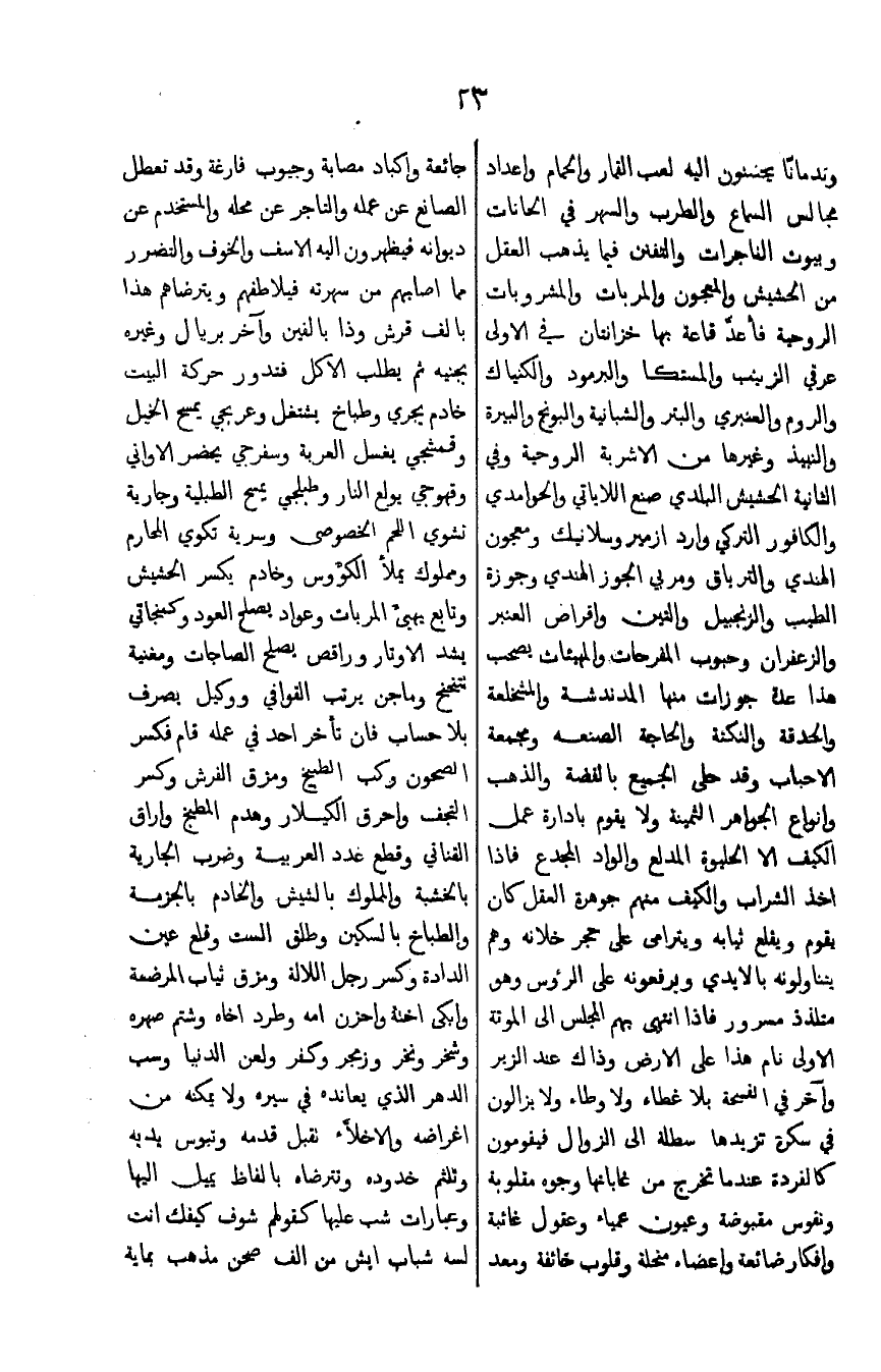 وندمانا يحسنون اليه لعب القمار والحمام واعداد جالس السماع والطرب والسهر في الحانات وبيوت الفاجرات والتفنن فيما يذهب العقل من الحشيش والمعجون والمربات والمشروبات الروحيه فاعد قاعة بها خزانتان في الاولى عرقي الزيب والمستكا والبمود والكنياك والروم والعنبري والبتر والشبانية والبونج والبيرة والنبيذ وغيرها من الاشربة الروحية وفي الثانية الحشيش البلدي صنع اللاياتي والحوامد والكافور التركي وارد ازمير وسلانيك ومعجون الهندي والترياق ومربي الجوز الهندي وجوزة الطيب والزنجبيل والتين واقراص العنبر والزعفران وحبوب المفرحات والهيئات يصحب هذا عدة جوزات منها المدندشة والمشخلعة والحدقه والنكتة والحاجة الصنعه ومجمعة الاحباب وقد حلى الجميع بالفضة والذهب وانواع الجواهر الثمينة ولا يقوم بادارة عمل الكيف الا الحليوة المدلع والواد المجدع فاذا اخذ الشراب والكيف منهم وجوهرة العقل كان يقوم ويقلع ثيابه ويترامى على حجر خلانه وهم يتناولونه بالا يدي ويرفعونه على الروس وهو متلذذ مسرور فاذا انتهى بهم المجلس الى الموتة الاولى نام هذا على الارض وذاك عد الزير واخر في الفسحة بلا غطاء ولا وطاء ولا يزالون في سكرة تزيدها سطلة الى الزوال فيقمون كالقردة عندما تخرج من غاباتها وجوه مقلوبة ونفوس مقبوضة وعيون عمياء وعقول غائبة وافكار ضائعة واعضاء منحلة وقلوب خائفة ومعد جائعة واكباد ماصبة وجيوب فارغة وقد تعطل الصانع عن عمله والتاجر عن محله والمستخدم عن ديوانه فيظهرون الية الاسف والخوف والتضرر مما اصابهم من سهرته فيلاطفهم ويترضاهم هذا بالف قرش وذا بالفين واخر بريال وغيره بجنيه ثم يطلب الاكل فتدور حركة البيت خادم يجري وطباخ يشتغل وعربجي يمسح النخيل وقمشجي يغسل العربة وسفرجي يحضر الاواني وقهوجي يولع النار وطبلجي يمسح الطبلية وجارية تشوي اللحم الخصوصي وسرية تكوي المحارم