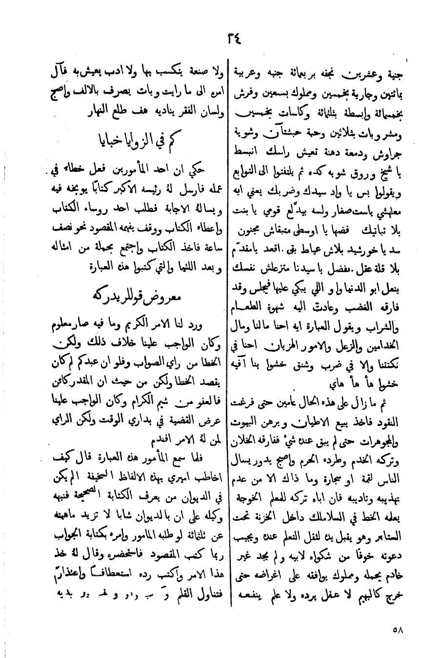 جنية وعشرين نجفه بربعمائة جنيه وعربيه بمائتين وجارية بخمسين ومملوك بسبعين وفرش بخمس مائة وابسطة بثلثمائة وكاسات بخمسين ومشروبات بثلاثين وحبة حبشتان وشوية جراوش ودمعة دهنة تعيش راسك انبسط ياشيخ وروق شوية كده ثم يلتفتوا الى التوابع ويقولوا بس ياواد سيدك وضربك يعني ليه معلهشي يا ست صغار ولسه بيد لع. قومي يابنت بلا تباتيك فضها يااوسطى متبقاش مجنون سد ياخورشيد بلاش عياط بقى اقعد يامقدم بلا قلة عقل. تفضل ياسيدنا متزعلش نفسك ينعل ابو الدنيا ولو اللي يبكي عليها فيجلس وقد فارقه الغضب وعادت اليه شهوه الطعام والشراب ويقول العبارة ليه احنا مالنا ومال الخدامين والزعل والامور الهزيان احنا في نكتتنا والا في ضرب وشنق خشوا بنا افيه خشوا هأ هأ هاي