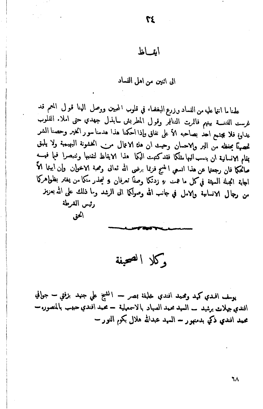 علمنا ما انتما عليه وزرع البغضاء في قلوب المحبين ووصل الينا قول المعمم قد غرست الفتنة بينهم فاثمرت التنافر وقول المطربش سابذل جهدي حتى املاء القلوب عداوة فلا يجتمع احد بصاحبه الا على نفاق واذا احكمنا هذا هدمنا سور الخير وحصنا الشر تحصيناً يحفظه من البر والاحسان وحيث ان هذه الاعمال من الخشونة البهيمة ولا يليق بمقام الانسانية ان ينسب اليها مثلكما هذا الايقاظ لتتنبها ونتبصرا فيما فيه صالحكما فان رجعتما عن هذا السعي القبيح فزتما برضى الله ومحبة الاخوان وان ابيتما الا اجابة الجبلة السيئة في كل ما همت به زدتكما وصفاً تعرفان به ليحذر منكما من يغتر بظواهركما من رجال الانسانية والامل في جانب الله وصولكما الى الرشد وما ذلك على الله بعزيز