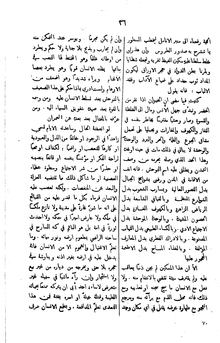 كتبت فيما مضى ان الحيوان اذا نفر من الحضر وتبدى جهل الانس ومال الى الغلظه والقسوة وصار وحشاً مفترساً يخاطر بنفسه في القفار والكهوف والمغارات ويحملها على تحمل مشاق الجوع والظماء والحر والبرد والوحده الوحشه لايبالي في ذلك مات حينه او غده وهذا الحد الذي وصله يحرمه من وصف التمدن ويطلق عليه اسم التوحش. فأنه انف من الاقامه في المدن ورضى في شوامخ الجبال بدل القصور العاليه وبمسارب الشعوب بدل الشوراع المنظمه وبالفيافي الشاسعه بدل الرياض الزاهرة وبالكهوف الغائرة بدل الحصون المشيدة. وبالوحدة الموحشة بدل الاجتماع الادبي. وبالكساء الطبيعي بدل الثياب المصنوعة. وبالادراك الفطري بدل المعارف المؤلفة. وبالغذاء المباح بدل الاطعمة