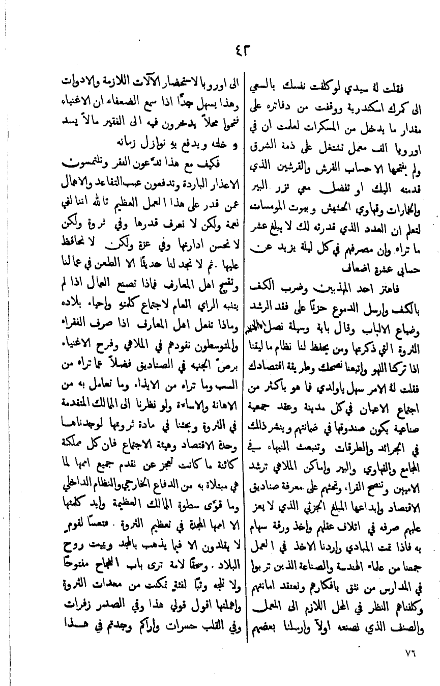 فكيف مع هذا تتدعون الفقر وتلتمسون الاعذار الباردة وتدفعون عبب التقاعد والاهمال عم من قدم هذا العمل العظيم تالله اننا لفي نعمة ولكن لانعرف قدرة وفي ثروة ولكن لانحسن ادارتها وفي عزة ولكن لانحافظ عليها. ثم لانجد لنا حديثاً الا الطعن في عمالنا وتقبيح اهل المعارف فماذا تصنع لعمال اذا لم يتنبة الراي العام لجتماع كلمتهِ واحياء بلاده وماذا تفعل اهل المعارف اذا صرف الفقراء والمتوسطون نقودهم في الملاهي وفرح الاغنياء برص الجنيه في صناديق فضلاً عما تراه من السب وما تره من الايذاء وما تعامل به من الاهانة والاساءه ولو نظرنا الى الممالك المتقدمه في الثروة وبحثنا في مادة ثروتهم لوجدناها وحدة الاقتصاد وهيئة الاجتماع فان كل مملكة كائنة ما كانت تعجز عن تقدم جميع اممها لما هي مبتلاة به من الدفاع الخارجي والنظام الداخلي وما قوى سطوة الممالك العظيمة وايد كلمتها الا اممها المجدة في تعظيم الثروة فتعساً لقومٍ لايقلدون الا فيما يذهب بالمجد ويميت روح البلاد. وسحقاً لامة ترى باب النجاح مفتوحاً ولا تلجه وتباً لفئةٍ تمكنت من معدات الثروة