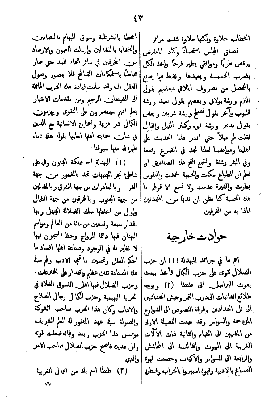 (1) البهدلة اسم مملكة الجنون وهي على شاطئ بحر الجنيهات تحد بالخمور من جهة الغر وبالعاهرات من جهة لشرق وبالمضلين من جهة الجنوب وبالمخرفين من جهة الشمال واول من اخلطها ملك الضلالة الجهل وبها مقدار تسعة وتسعين من مائة من لعالم ومواسم البهتان فيها دائمة الرواج وحظ السجون فيها لانظير لهُ في الوجود وصناعة اهلها افساد ما احكم العقل وتحسين ما قسمه الادب ولهم في هذة الصناعة تفنن عظيم واقتدار على المخترعات. وحزب الضلال فيها اهل الفسوق الغلاة في لحرية البهيمة وحزب الكمال رجال الصلاح والاداب وكان هذا الحزب صاحب الشوكه ولصولة في عهد المغفور لهُ العلم الشريف مؤسس هذا الحزب وبعد وفاته ضعفت قوته وقل عديده فاصبح حزب الضلال صاحب الامر والنهي