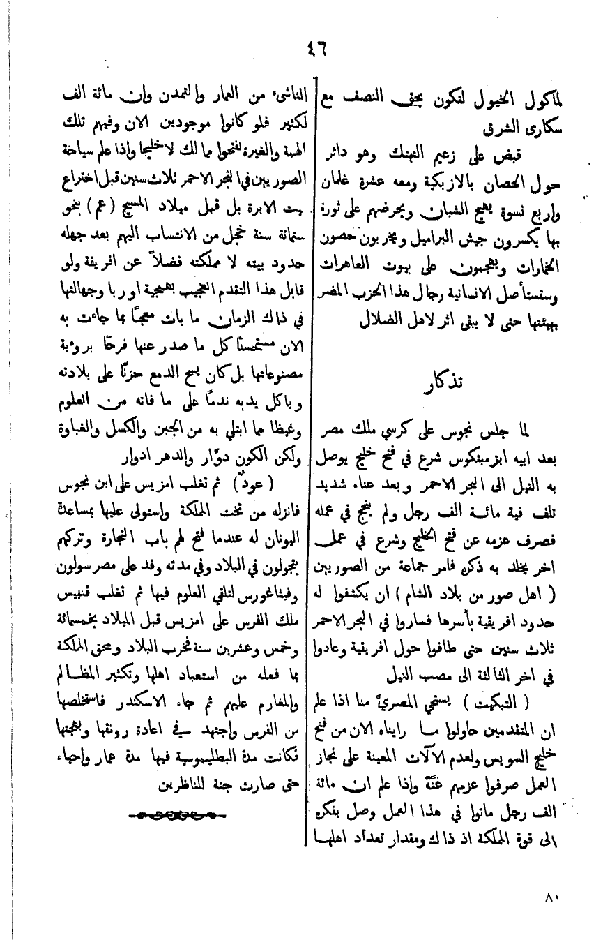 (التبكيت) يستحي المصري منا اذا علم ان المتتقدمين حاولوا ما رايناه الان من فتح خليج السويس ولعدم الالآت المعينة على نجاز العمل صرفوا عزمهم عنه واذا علم ان مائة الف رجل ماتوا في هذا العمل وصل بفكره الى قوة المملكة اذ ذاك ومقدار تعداد اهلها