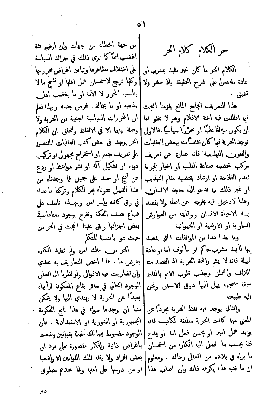 والثاني يوجد فيه لفظ الحريه مجرداً عن المعنى مهما كانت الحرية مطلقة لكاتبه فانه يؤيد عمل امير او يحسن فعل امة او يمدح فئة بحسب ما تصل اليه افكاره من استحسان ما يراه في بلاده من افعال رجاله. ومعلوم ان مايحبه هذا يكرهه ذاك وان اصاب هذا من جهة اخطاء من جهات وان ارضى فئة اغضب امماً كما نرى ذلك في جرائد السياسة على اختلاف مظاهرها وتباين اغراض محرريها وكلها ترجع لاستحسان عمل اهلها او تقبيح ما لا يناسب المحرر لا الامة او مايغضب اهل مذهبه او يخالف غرض جنسه وبهذا نعلم ان المحررات السياسية اجنبية من الحرية ولا وصلة بينهما الا في الالفاظ ونتحقق ان الكلام الحر يوجد في بعض كتب العقليات المقتصرة على تعريف جسم او استخراج مجهول او تركيب دواء او تشكيل الة او نشر مواعظ او ردع عن قبيح او حث على جميل فما وجدناه من هذا القبيل عنوانه بحر الكلام وتركنا ماعداه في رق كتابه واسر امره وبهذا ناسف على ضياع نصف الحكمة ونفرح بوجود معناها في بعض اجزائها وبقى علينا البحث في الحر من حيث هو بالنسبة للمتكلم