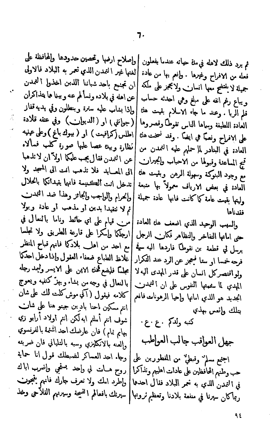 اجتمع مسلم وقبطي من المفطورين على حب وطنهم المحافظين على عادات اهليهم وتذاكرا في التمدن الذي به تعمر البلاد فقال احدهما ربما كان سيرنا في منفعة بلادنا وتعظيم ثروتها واصلاح ارضها وتحصين حدودها والمحافظة على لغتها غير التمدن الذي تعمر به البلاد فالاولى ان نجتمع باحد شباننا الذين اخذوا التمدن عن اهله في بلاده ونسألهم عنه وبينما هما يتذكران واذا بشاب عليه سترة وبنطلون وفي يديه قفاز (جوانتي) او (الديوان) وفي عنقه قلادة اطلس (كرافيت) او (بيوك باغ) وعلى عينيه نظارة وبين عصا عليها صورة كلب فسألاه عن التمدن فقال يجب عليكما اولاً ان لا تذهبا الى المعابد فلا تذهب انت الى المسجد ولا تدخل انت الكنيسة فا نهما يقيدانكما بالحلال والحرام والواجب والجائز وهذا ضد التمدن ثم لا تتقيدا بدين او مذهب او عادة وبولا من قيام على أي حائط وناما بالنعال في ارجلكما واسكرا على قارعة الطريق ولا تجلسا مع احد من اهل بلادكما فانهم قباح المنظر غلاظ الطباع ضعفاء العقول واذا دخل احدكما مجلساً فليضع فخذه الايمن على الايسر وليمد رجله بالنعال في وجه من يشاء ويهز كتفيه ويعوج كلامه فيقول (آني موش كلت لك على شان انتم مسكين احنا بادين جيتو هنا على شان شوف انتم املتم ايه لكن انتم اولاد أرابو زي بهايم تمام) فان عارضك احد اشمتهُ بالفرنسوي والعنه بالانكليزي وسبه بالتلياني فان ضربته وجاء احد العساكر اضبطك قول انا حماية روح هات لي واحد بسقجي واضرب اباك واطرد امك ولاتعرف جارك فانهم يقبحون سيرتك بافعالهم القبيحة وسيرتهم الفلأحي وخذ