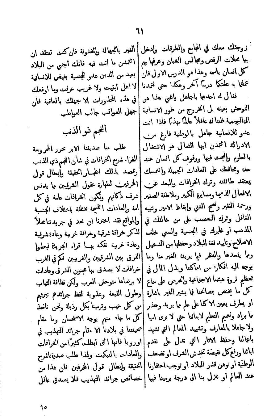 طلب منا صديقنا الابر محرر المحروسة الغراء شرح الخرافات في شأن النجم ذي الذنب وقصد بذلك اظهار الحقيقة وابطال قول المخرفين لطهارة عقول الشرقيين مما يدنس شرف ذكائهم ولكون الخرافات عامة في كل امة والعادات القبيحة مختلفة باختلاف الجنسية والمواقع فقد اخترنا ان نعد في جريدتنا محلاً لذكر خرافة شرقية وخرافة غربية وعادة شرقية وعادة غربية نفكه بها قراء الجريدة ليعلموا الفرق بين الشرقيين والغربيين فكم في الغرب خرافات لايصدق بها مجنون الشرق وعادات لا يرضاها متوحش العرب ولكن نظافة الثياب وطول القبعة وعذوبة لفظ جرائدهم تبرئهم من كل عيب وترمينا بكل رذيلة ونحن ناخذ كل ما جاء منهم بوجه الاستحسان ومقام صحيفتنا في بلادنا الا مقام جرائد التهذيب في اوروبا فانا التي ابطلت كثيرا من الخرافات والعادات بالتبكيت ولهذا طلب صديقنا شرح الحقيقة وابطال قول المخرفين فان هذا من خصائص جرائد التهذيب فلا يصدق عاقل