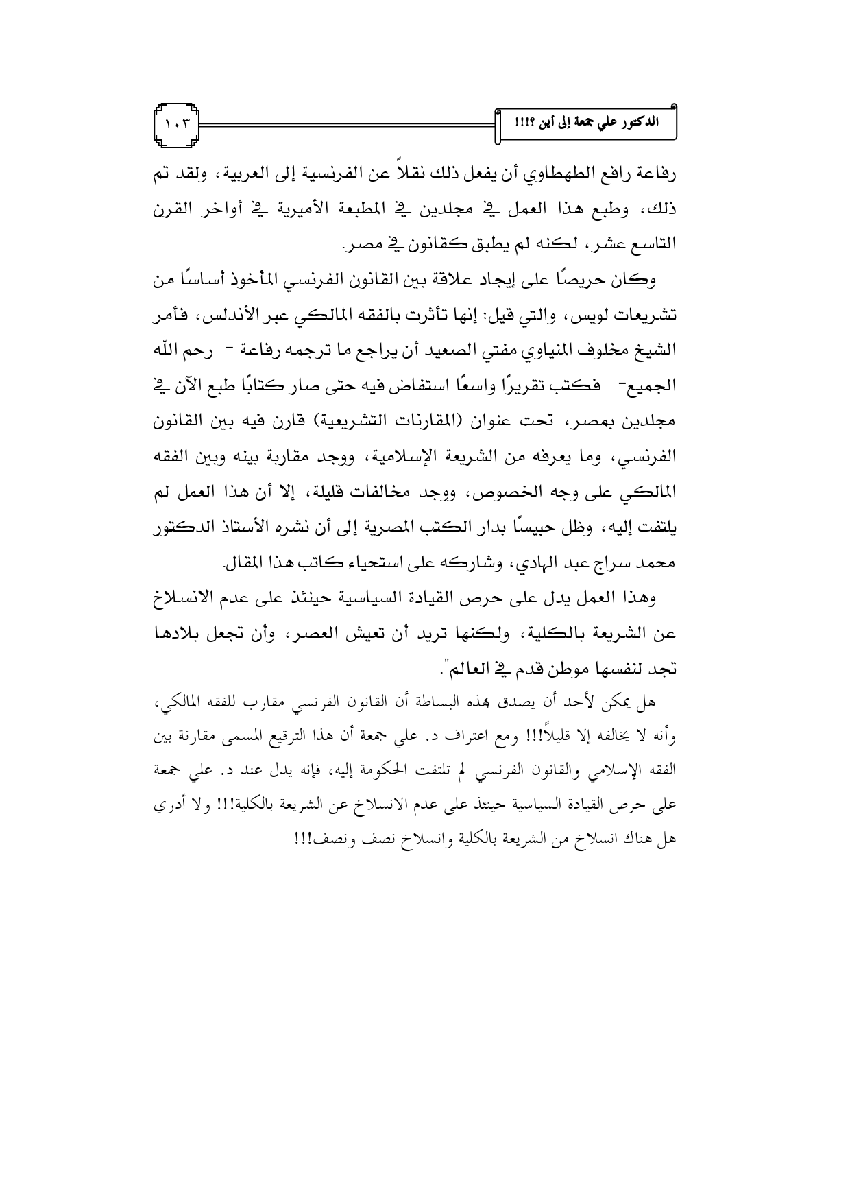 هل يمكن لأحد أن يصدق بهذه البساطة أن القانون الفرنسي مقارب للفقه المالكي، وأنه لا يخالفه إلا قليلاً!!! ومع اعتراف د. علي جمعة أن هذا الترقيع المسمى مقارنة بين الفقه الإسلامي والقانون الفرنسي لم تلتفت الحكومة إليه، فإنه يدل عند د. علي جمعة على حرص القيادة السياسية حينئذ على عدم الانسلاخ عن الشريعة بالكلية!!! ولا أدري هل هناك انسلاخ من الشريعة بالكلية وانسلاخ نصف ونصف!!!