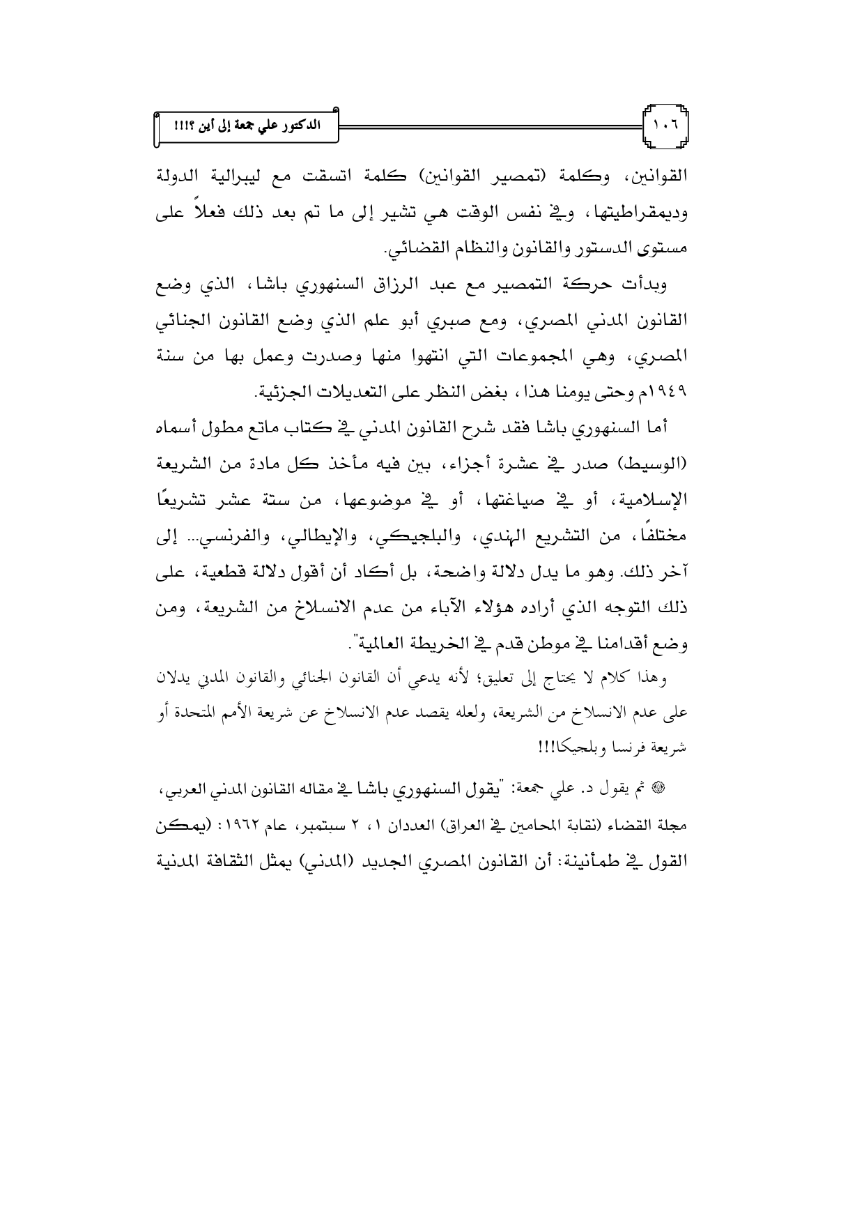 * ثم يقول د. علي جمعة: "يقول السنهوري باشا في مقاله القانون المدني العربي، مجلة القضاء (نقابة المحامين في العراق) العددان 1، 2 سبتمبر، عام 1962: (يمكن القول في طمأنينة: أن القانون المصري الجديد (المدني) يمثل الثقافة المدنية