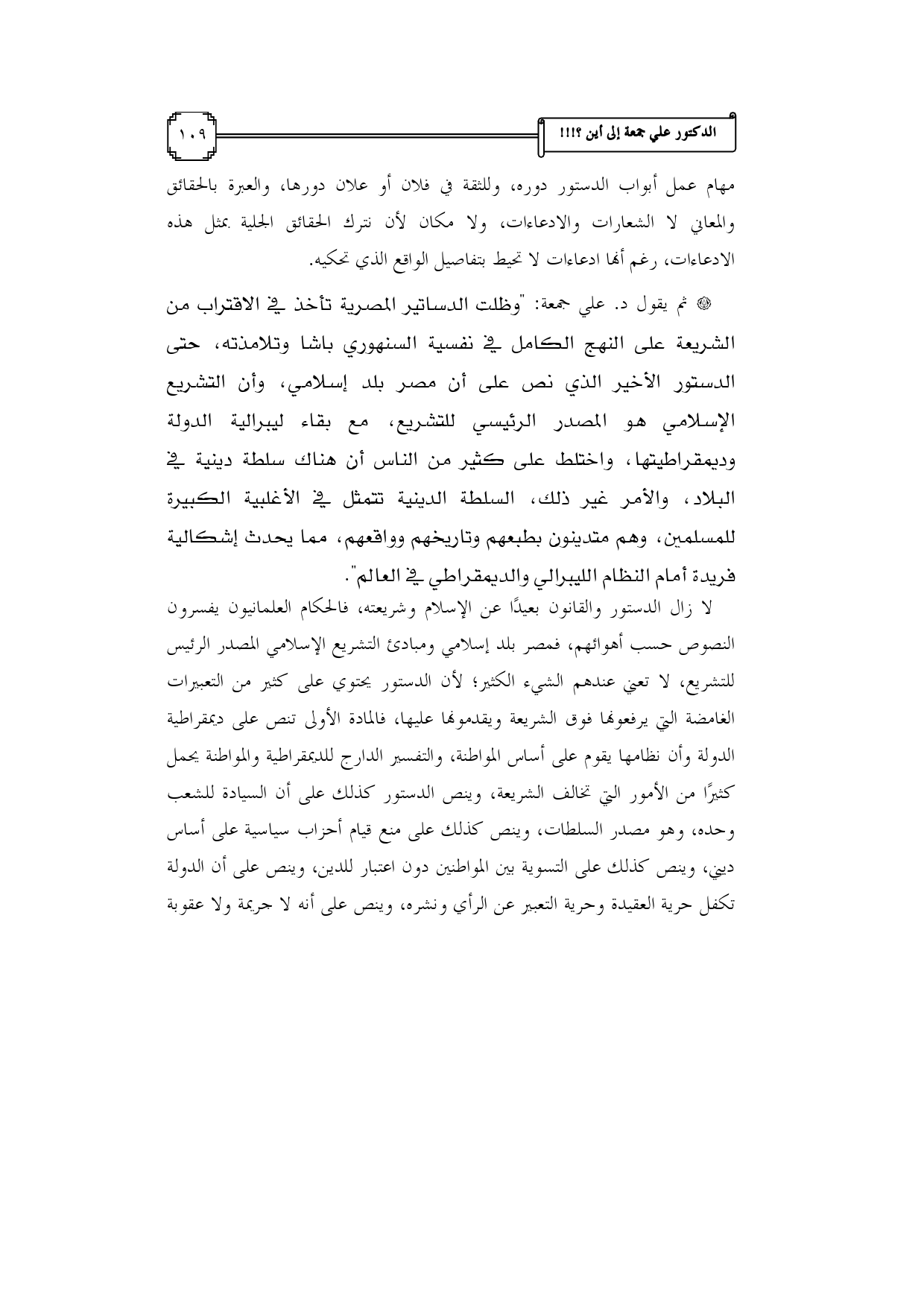 * ثم يقول د. علي جمعة: "وظلت الدساتير المصرية تأخذ في الاقتراب من الشريعة على النهج الكامل في نفسية السنهوري باشا وتلامذته، حتى الدستور الأخير الذي نص على أن مصر بلد إسلامي، وأن التشريع الإسلامي هو المصدر الرئيسي للتشريع، مع بقاء ليبرالية الدولة وديمقراطيتها، واختلط على كثير من الناس أن هناك سلطة دينية في البلاد، والأمر غير ذلك، السلطة الدينية تتمثل في الأغلبية الكبيرة للمسلمين، وهم متدينون بطبعهم وتاريخهم وواقعهم، مما يحدث إشكالية فريدة أمام النظام الليبرالي والديمقراطي في العالم".