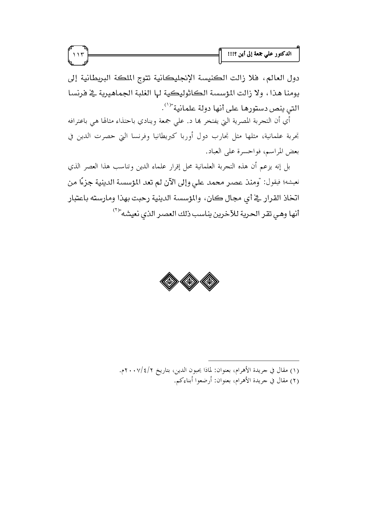 (¬1) مقال في جريدة الأهرام، بعنوان: لماذا يحبون الدين، بتاريخ 2/ 4/2007م.