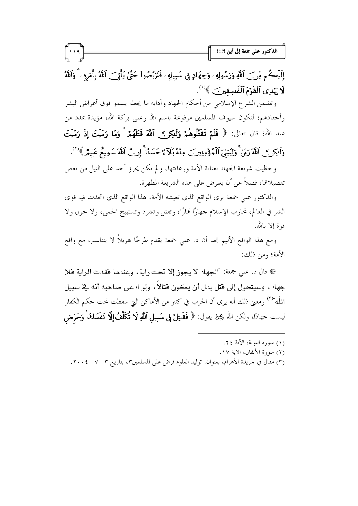 * قال د. علي جمعة: "الجهاد لا يجوز إلا تحت راية، وعندما فقدت الراية فلا جهاد، وسيتحول إلى قتل بدل أن يكون قتالاً، ولو ادعى صاحبه أنه في سبيل الله" (¬3) ومعنى ذلك أنه يرى أن الحرب في كثير من الأماكن التي سقطت تحت حكم الكفار ليست جهادًا، ولكن الله عز وجل يقول: {فَقَاتِلْ فِي سَبِيلِ اللَّهِ لَا تُكَلَّفُ إِلَّا نَفْسَكَ وَحَرِّضِ