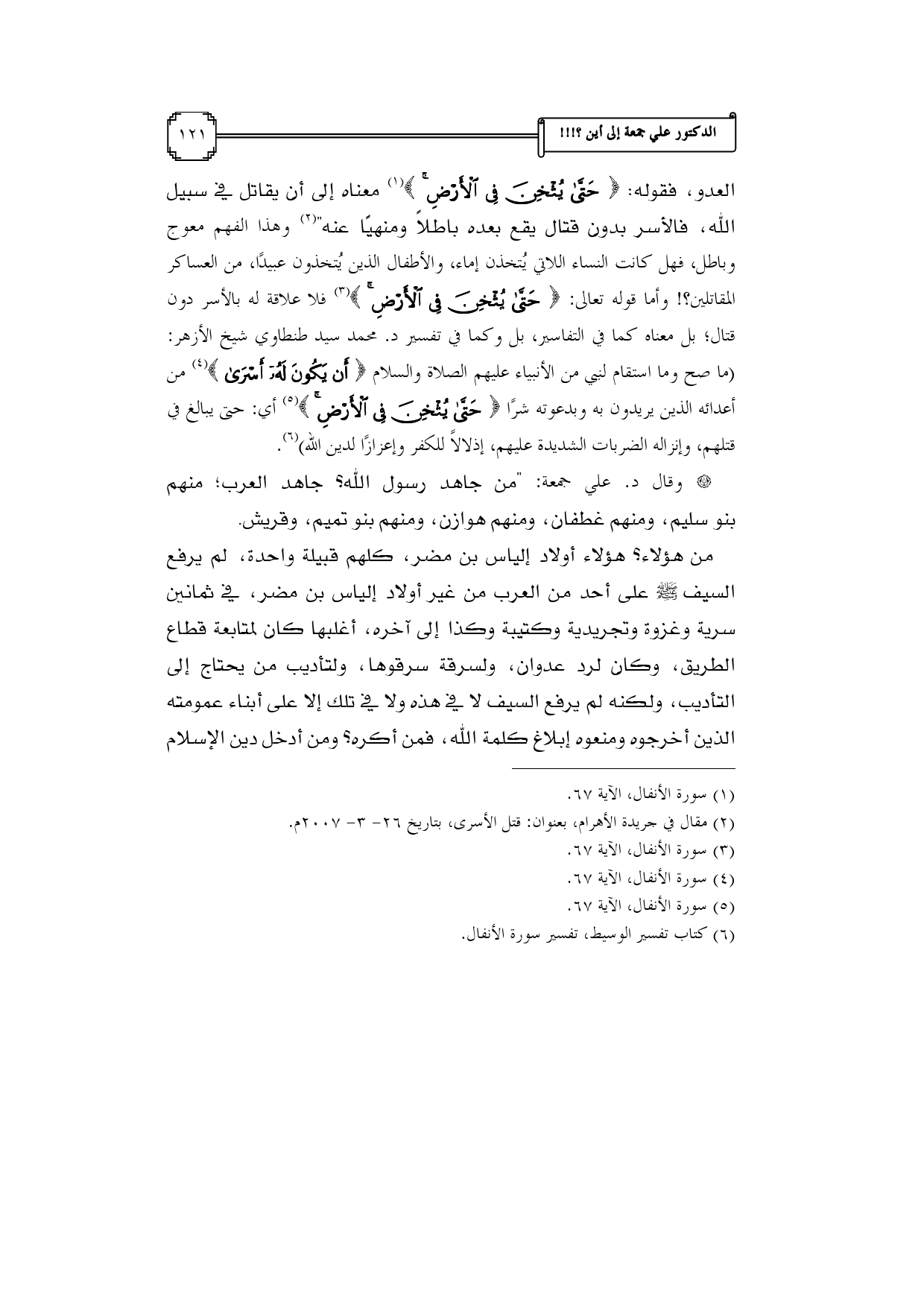 العدو، فقوله: {حَتَّى يُثْخِنَ فِي الْأَرْضِ} (¬1) معناه إلى أن يقاتل في سبيل الله، فالأسر بدون قتال يقع بعده باطلاً ومنهيًا عنه" (¬2) وهذا الفهم معوج وباطل، فهل كانت النساء اللاتي يُتخذن إماء، والأطفال الذين يُتخذون عبيدًا، من العساكر المقاتلين؟! وأما قوله تعالى: {حَتَّى يُثْخِنَ فِي الْأَرْضِ} (¬3) فلا علاقة له بالأسر دون قتال؛ بل معناه كما في التفاسير، بل وكما في تفسير د. محمد سيد طنطاوي شيخ الأزهر: (ما صح وما استقام لنبي من الأنبياء عليهم الصلاة والسلام {أَنْ يَكُونَ لَهُ أَسْرَى} (¬4) من أعدائه الذين يريدون به وبدعوته شرًا {حَتَّى يُثْخِنَ فِي الْأَرْضِ} (¬5) أي: حتى يبالغ في قتلهم، وإنزاله الضربات الشديدة عليهم، إذلالاً للكفر وإعزازًا لدين الله) (¬6).