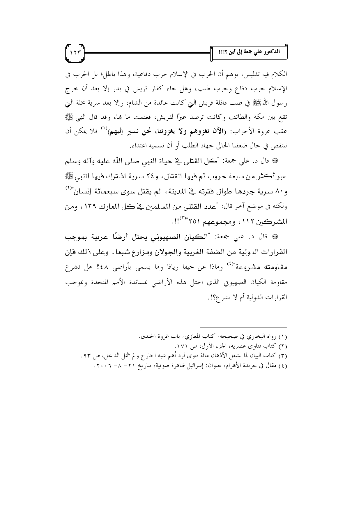 * قال د. علي جمعة: "الكيان الصهيوني يحتل أرضًا عربية بموجب القرارات الدولية من الضفة الغربية والجولان ومزارع شبعا، وعلى ذلك فإن مقاومته مشروعة" (¬4) وماذا عن حيفا ويافا وما يسمى بأراضي 48؟ هل تشرع مقاومة الكيان الصهيوني الذي احتل هذه الأراضي بمساندة الأمم المتحدة وبموجب القرارات الدولية أم لا تشرع؟!.
