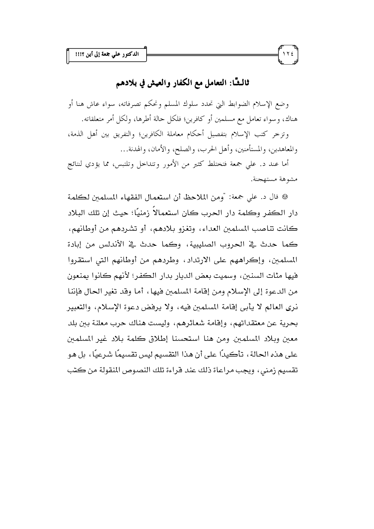 * قال د. علي جمعة: "ومن الملاحظ أن استعمال الفقهاء المسلمين لكلمة دار الكفر وكلمة دار الحرب كان استعمالاً زمنيًا؛ حيث إن تلك البلاد كانت تناصب المسلمين العداء، وتغزو بلادهم، أو تشردهم من أوطانهم، كما حدث في الحروب الصليبية، وكما حدث في الأندلس من إبادة المسلمين، وإكراههم على الارتداد، وطردهم من أوطانهم التي استقروا فيها مئات السنين، وسميت بعض الديار بدار الكفر؛ لأنهم كانوا يمنعون من الدعوة إلى الإسلام ومن إقامة المسلمين فيها، أما وقد تغير الحال فإننا نرى العالم لا يأبى إقامة المسلمين فيه، ولا يرفض دعوة الإسلام، والتعبير بحرية عن معتقداتهم، وإقامة شعائرهم، وليست هناك حرب معلنة بين بلد معين وبلاد المسلمين. ومن هنا استحسنا إطلاق كلمة بلاد غير المسلمين على هذه الحالة، تأكيدًا على أن هذا التقسيم ليس تقسيمًا شرعيًا، بل هو تقسيم زمني، ويجب مراعاة ذلك عند قراءة تلك النصوص المنقولة من كتب