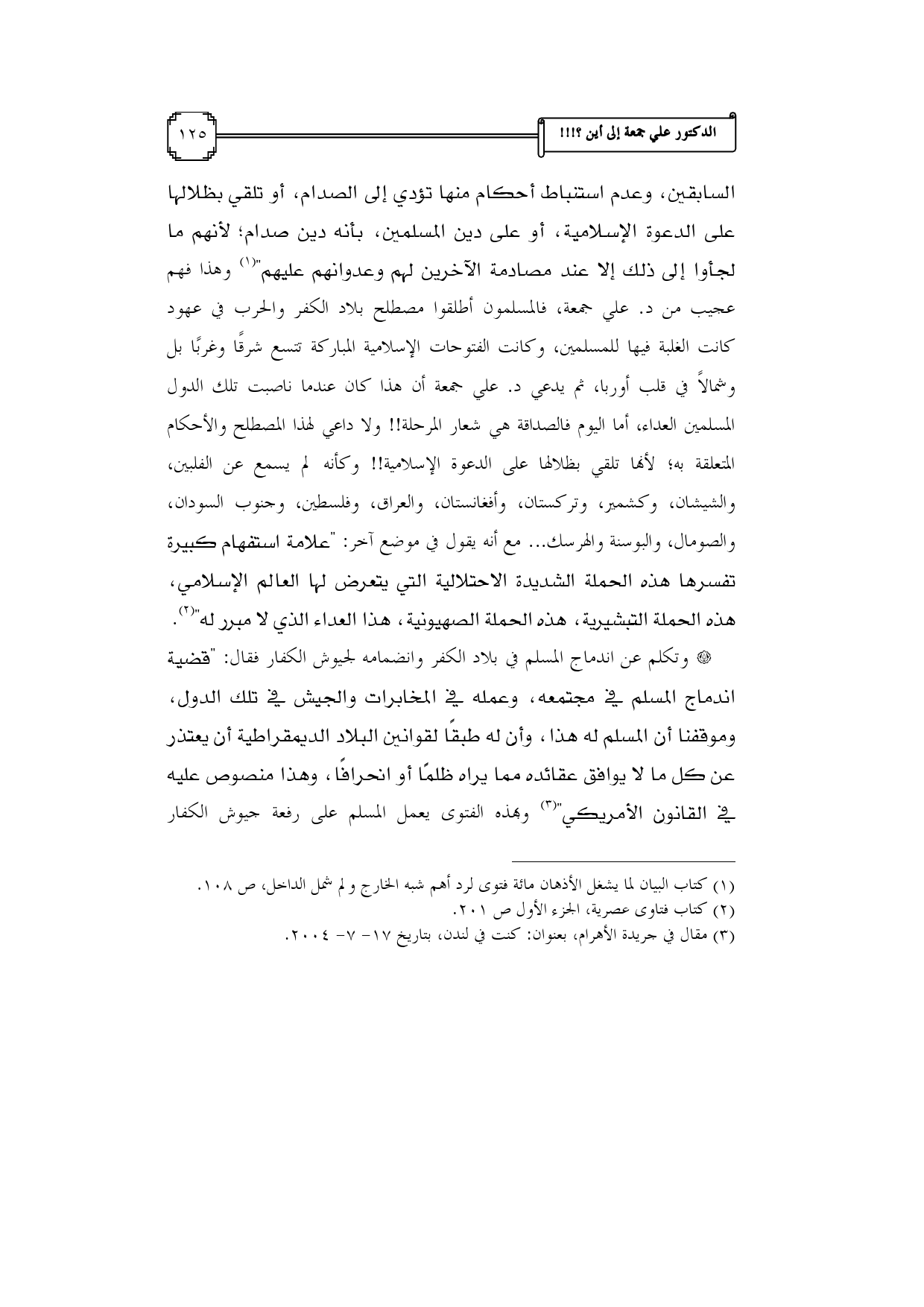 السابقين، وعدم استنباط أحكام منها تؤدي إلى الصدام، أو تلقي بظلالها على الدعوة الإسلامية، أو على دين المسلمين، بأنه دين صدام؛ لأنهم ما لجأوا إلى ذلك إلا عند مصادمة الآخرين لهم وعدوانهم عليهم" (¬1) وهذا فهم عجيب من د. علي جمعة، فالمسلمون أطلقوا مصطلح بلاد الكفر والحرب في عهود كانت الغلبة فيها للمسلمين، وكانت الفتوحات الإسلامية المباركة تتسع شرقًا وغربًا بل وشمالاً في قلب أوربا، ثم يدعي د. علي جمعة أن هذا كان عندما ناصبت تلك الدول المسلمين العداء، أما اليوم فالصداقة هي شعار المرحلة!! ولا داعي لهذا المصطلح والأحكام المتعلقة به؛ لأنها تلقي بظلالها على الدعوة الإسلامية!! وكأنه لم يسمع عن الفلبين، والشيشان، وكشمير، وتركستان، وأفغانستان، والعراق، وفلسطين، وجنوب السودان، والصومال، والبوسنة والهرسك ... مع أنه يقول في موضع آخر: "علامة استفهام كبيرة تفسرها هذه الحملة الشديدة الاحتلالية التي يتعرض لها العالم الإسلامي، هذه الحملة التبشيرية، هذه الحملة الصهيونية، هذا العداء الذي لا مبرر له" (¬2).