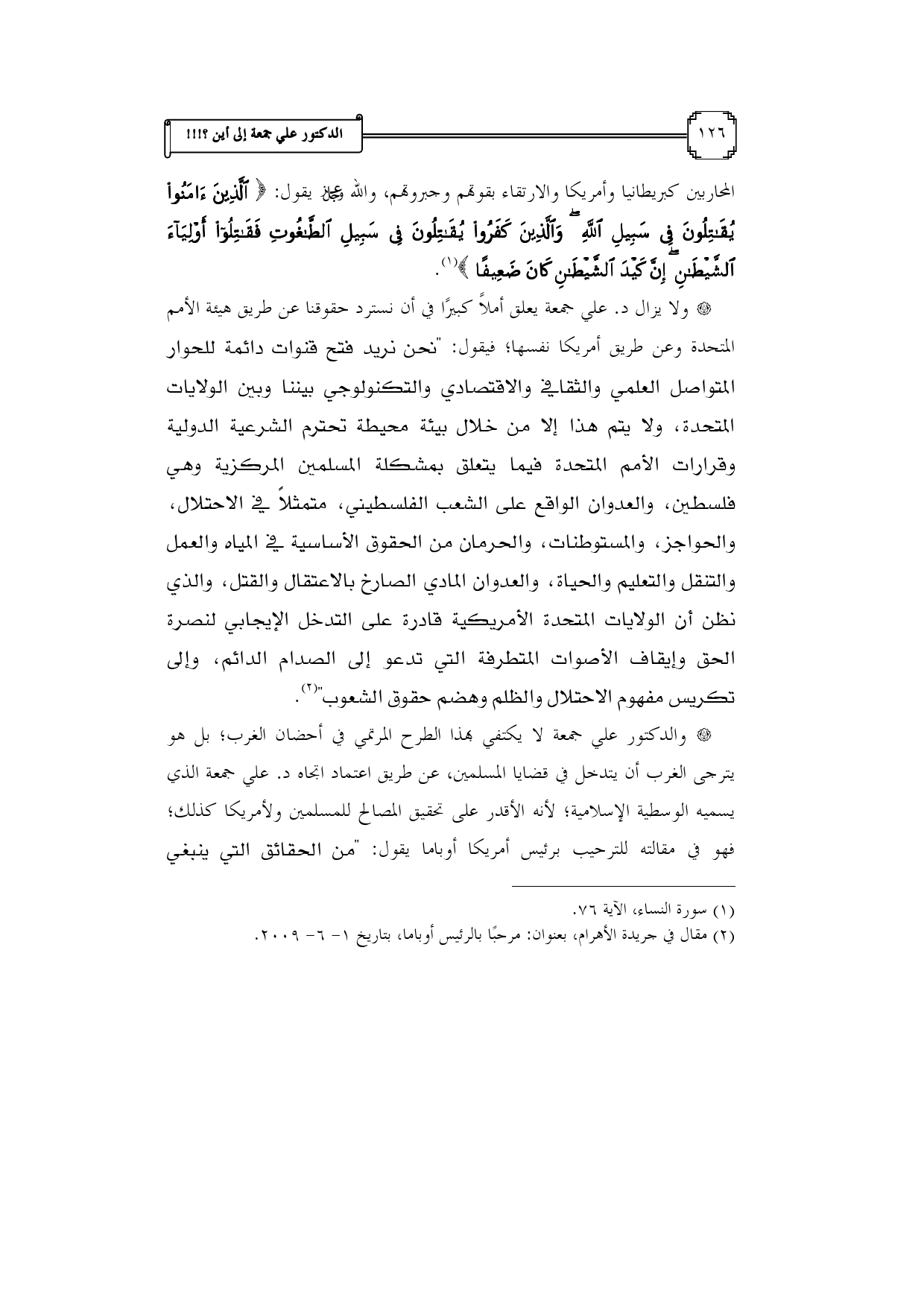 * ولا يزال د. علي جمعة يعلق أملاً كبيرًا في أن نسترد حقوقنا عن طريق هيئة الأمم المتحدة وعن طريق أمريكا نفسها؛ فيقول: "نحن نريد فتح قنوات دائمة للحوار المتواصل العلمي والثقافي والاقتصادي والتكنولوجي بيننا وبين الولايات المتحدة، ولا يتم هذا إلا من خلال بيئة محيطة تحترم الشرعية الدولية وقرارات الأمم المتحدة فيما يتعلق بمشكلة المسلمين المركزية وهي فلسطين، والعدوان الواقع على الشعب الفلسطيني، متمثلاً في الاحتلال، والحواجز، والمستوطنات، والحرمان من الحقوق الأساسية في المياه والعمل والتنقل والتعليم والحياة، والعدوان المادي الصارخ بالاعتقال والقتل، والذي نظن أن الولايات المتحدة الأمريكية قادرة على التدخل الإيجابي لنصرة الحق وإيقاف الأصوات المتطرفة التي تدعو إلى الصدام الدائم، وإلى تكريس مفهوم الاحتلال والظلم وهضم حقوق الشعوب" (¬2).