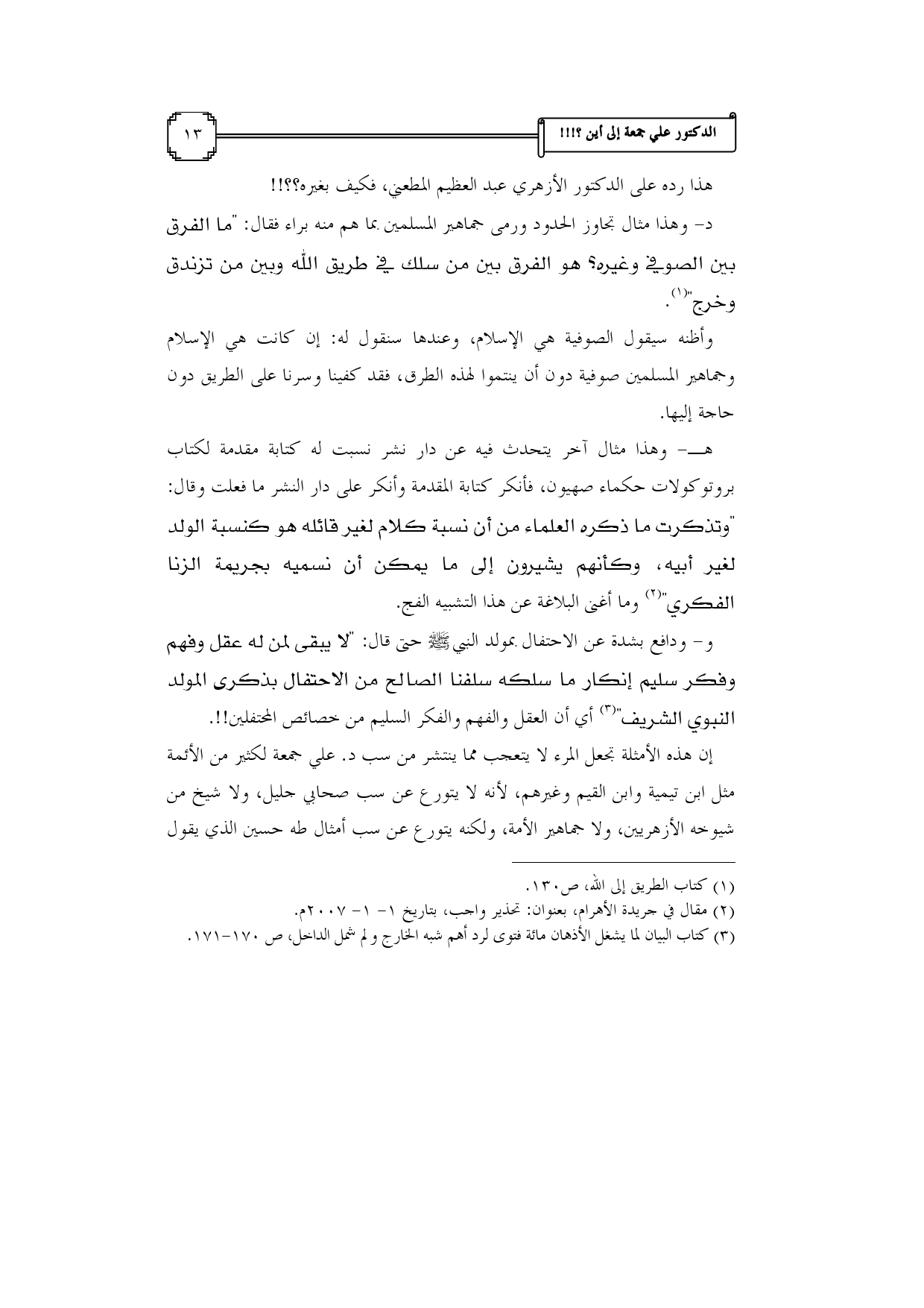 د- وهذا مثال تجاوز الحدود ورمى جماهير المسلمين بما هم منه براء فقال: "ما الفرق بين الصوفي وغيره؟ هو الفرق بين من سلك في طريق الله وبين من تزندق وخرج" (¬1).