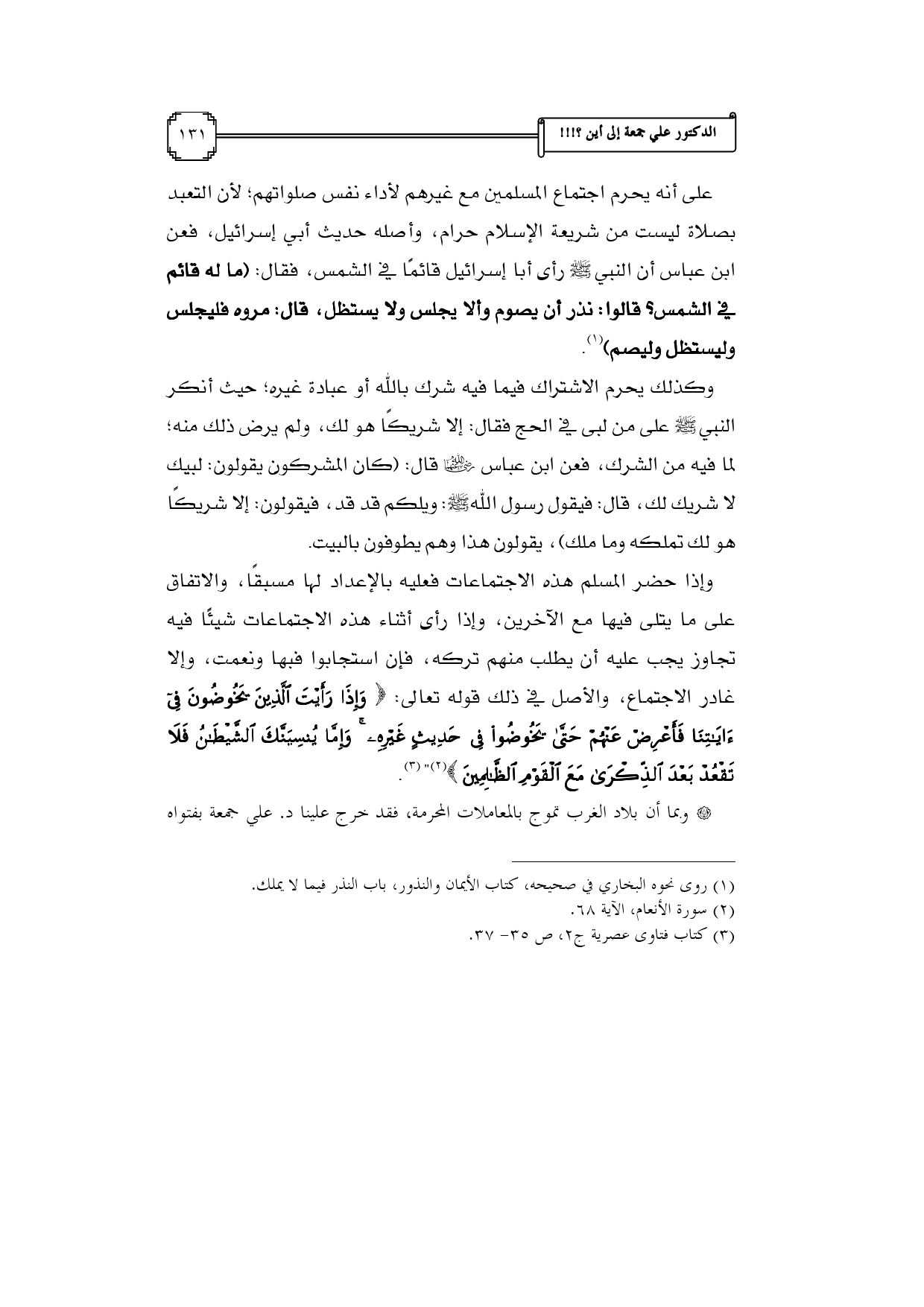 على أنه يحرم اجتماع المسلمين مع غيرهم لأداء نفس صلواتهم؛ لأن التعبد بصلاة ليست من شريعة الإسلام حرام، وأصله حديث أبي إسرائيل، فعن ابن عباس أن النبي صلى الله عليه وسلم رأى أبا إسرائيل قائمًا في الشمس، فقال: (ما له قائم في الشمس؟ قالوا: نذر أن يصوم وألا يجلس ولا يستظل، قال: مروه فليجلس وليستظل وليصم) (¬1).
