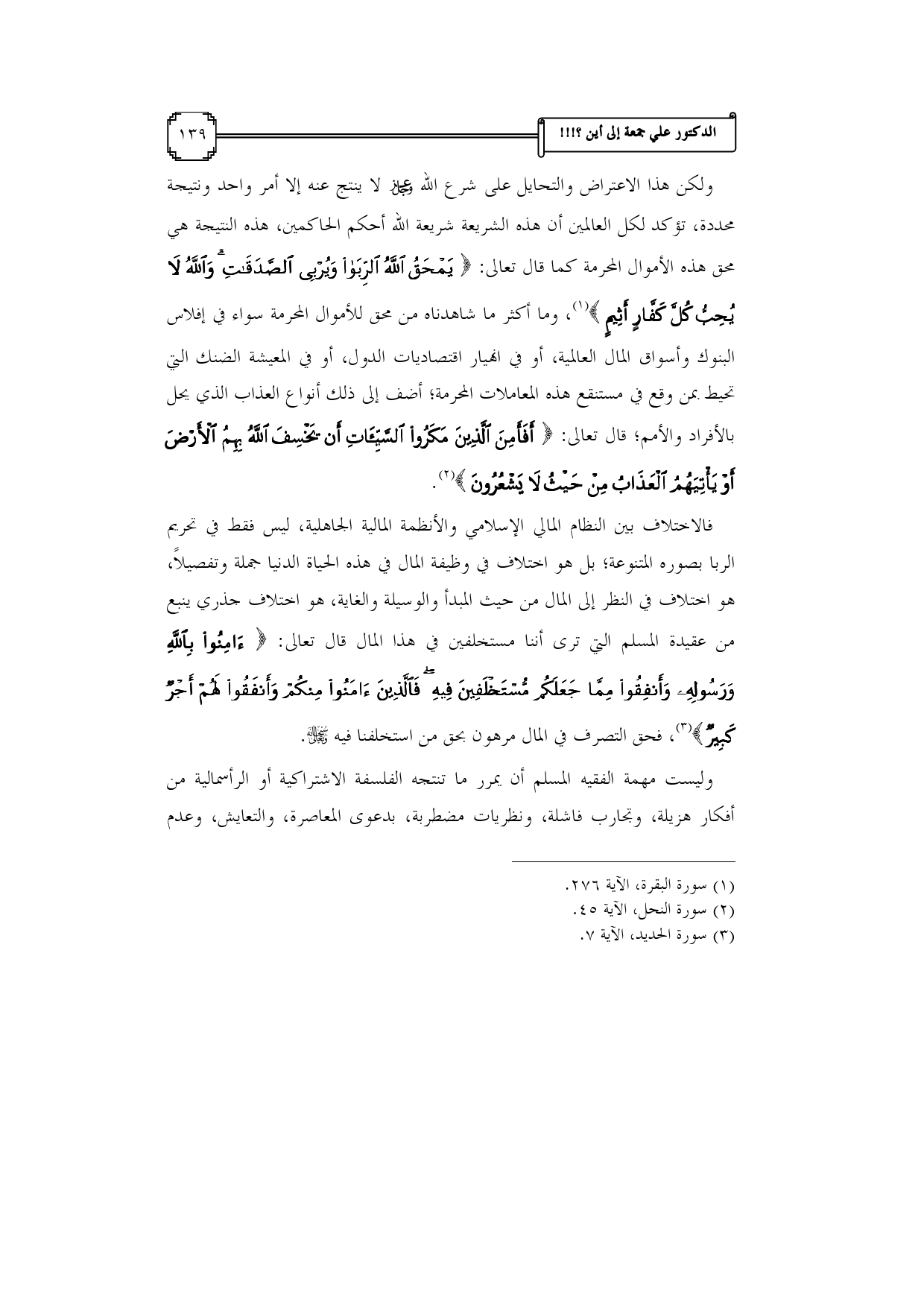 ولكن هذا الاعتراض والتحايل على شرع الله عز وجل لا ينتج عنه إلا أمر واحد ونتيجة محددة، تؤكد لكل العالمين أن هذه الشريعة شريعة الله أحكم الحاكمين، هذه النتيجة هي محق هذه الأموال المحرمة كما قال تعالى: {يَمْحَقُ اللَّهُ الرِّبَا وَيُرْبِي الصَّدَقَاتِ وَاللَّهُ لَا يُحِبُّ كُلَّ كَفَّارٍ أَثِيمٍ} (¬1)، وما أكثر ما شاهدناه من محق للأموال المحرمة سواء في إفلاس البنوك وأسواق المال العالمية، أو في انهيار اقتصاديات الدول، أو في المعيشة الضنك التي تحيط بمن وقع في مستنقع هذه المعاملات المحرمة؛ أضف إلى ذلك أنواع العذاب الذي يحل بالأفراد والأمم؛ قال تعالى: {أَفَأَمِنَ الَّذِينَ مَكَرُوا السَّيِّئَاتِ أَنْ يَخْسِفَ اللَّهُ بِهِمُ الْأَرْضَ أَوْ يَأْتِيَهُمُ الْعَذَابُ مِنْ حَيْثُ لَا يَشْعُرُونَ} (¬2).