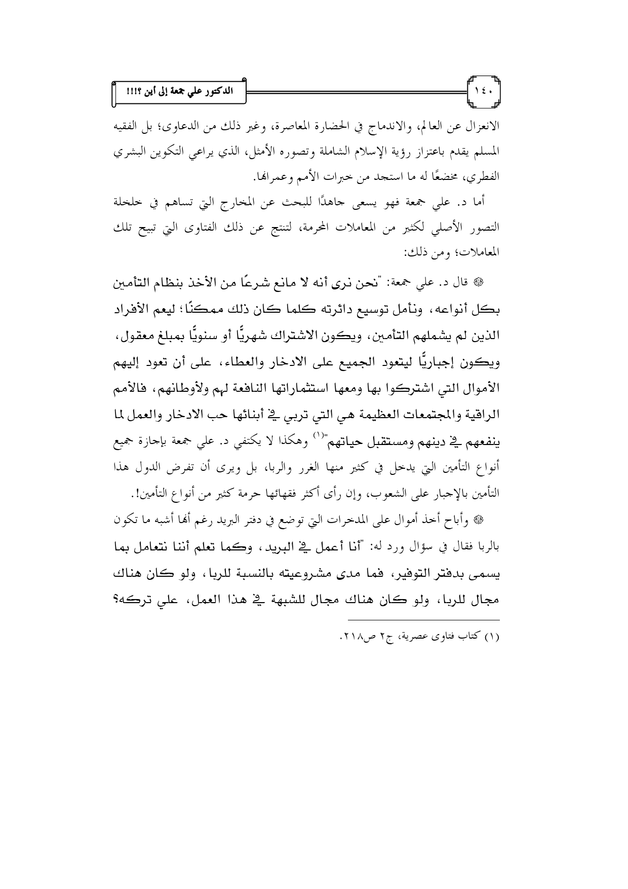 * قال د. علي جمعة: "نحن نرى أنه لا مانع شرعًا من الأخذ بنظام التأمين بكل أنواعه، ونأمل توسيع دائرته كلما كان ذلك ممكنًا؛ ليعم الأفراد الذين لم يشملهم التأمين، ويكون الاشتراك شهريًّا أو سنويًّا بمبلغ معقول، ويكون إجباريًّا ليتعود الجميع على الادخار والعطاء، على أن تعود إليهم الأموال التي اشتركوا بها ومعها استثماراتها النافعة لهم ولأوطانهم، فالأمم الراقية والمجتمعات العظيمة هي التي تربي في أبنائها حب الادخار والعمل لما ينفعهم في دينهم ومستقبل حياتهم" (¬1) وهكذا لا يكتفي د. علي جمعة بإجازة جميع أنواع التأمين التي يدخل في كثير منها الغرر والربا، بل ويرى أن تفرض الدول هذا التأمين بالإجبار على الشعوب، وإن رأى أكثر فقهائها حرمة كثير من أنواع التأمين!.