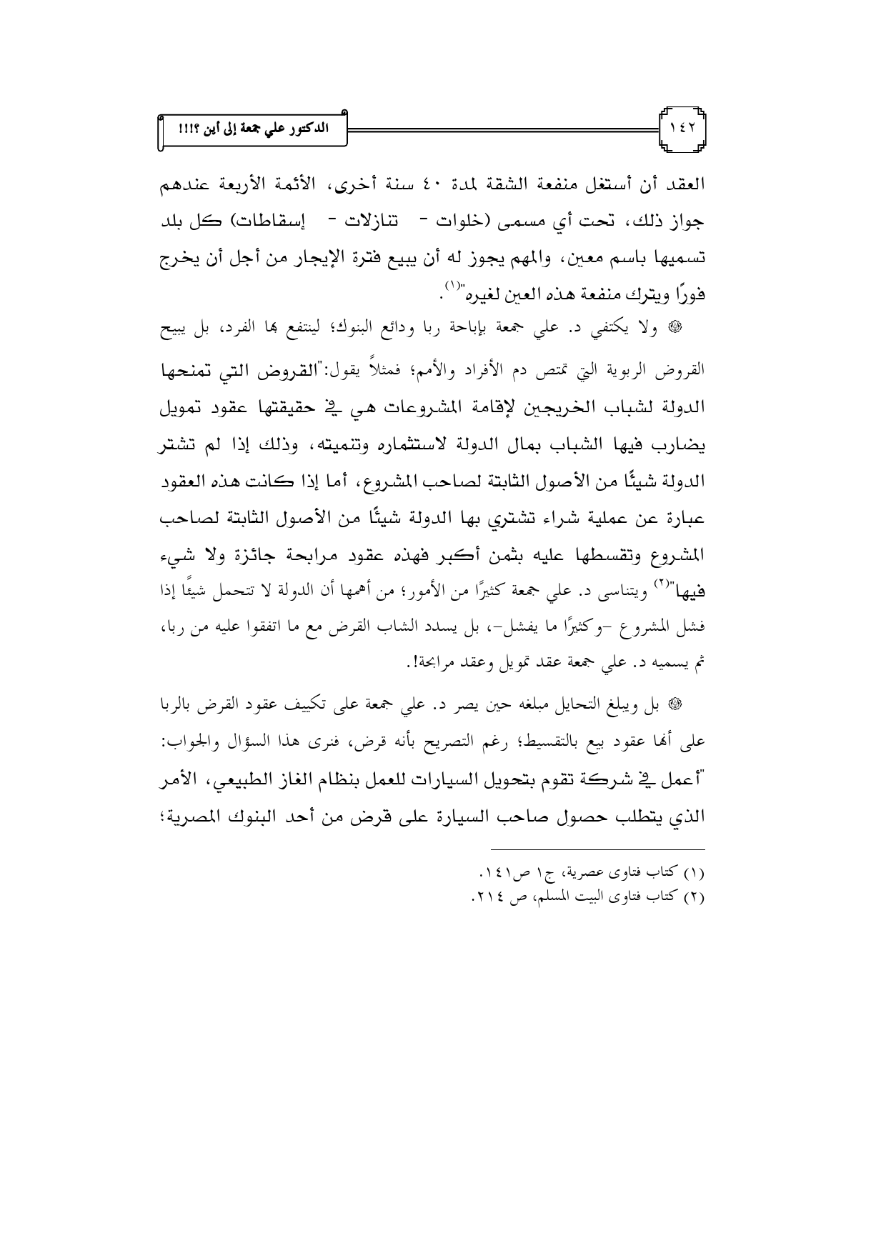* بل ويبلغ التحايل مبلغه حين يصر د. علي جمعة على تكييف عقود القرض بالربا على أنها عقود بيع بالتقسيط؛ رغم التصريح بأنه قرض، فنرى هذا السؤال والجواب: "أعمل في شركة تقوم بتحويل السيارات للعمل بنظام الغاز الطبيعي، الأمر الذي يتطلب حصول صاحب السيارة على قرض من أحد البنوك المصرية؛