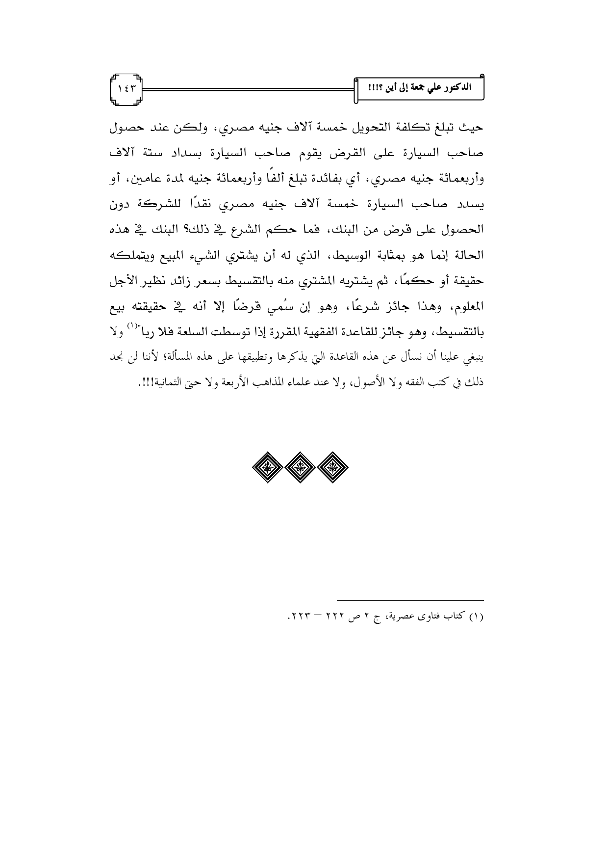 حيث تبلغ تكلفة التحويل خمسة آلاف جنيه مصري، ولكن عند حصول صاحب السيارة على القرض يقوم صاحب السيارة بسداد ستة آلاف وأربعمائة جنيه مصري، أي بفائدة تبلغ ألفًا وأربعمائة جنيه لمدة عامين، أو يسدد صاحب السيارة خمسة آلاف جنيه مصري نقدًا للشركة دون الحصول على قرض من البنك، فما حكم الشرع في ذلك؟ البنك في هذه الحالة إنما هو بمثابة الوسيط، الذي له أن يشتري الشيء المبيع ويتملكه حقيقة أو حكمًا، ثم يشتريه المشتري منه بالتقسيط بسعر زائد نظير الأجل المعلوم، وهذا جائز شرعًا، وهو إن سُمي قرضًا إلا أنه في حقيقته بيع بالتقسيط، وهو جائز للقاعدة الفقهية المقررة إذا توسطت السلعة فلا ربا" (¬1) ولا ينبغي علينا أن نسأل عن هذه القاعدة التي يذكرها وتطبيقها على هذه المسألة؛ لأننا لن نجد ذلك في كتب الفقه ولا الأصول، ولا عند علماء المذاهب الأربعة ولا حتى الثمانية!!!.
