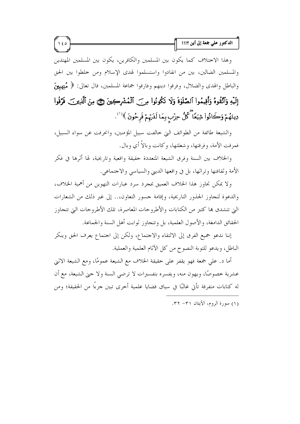 أما د. علي جمعة فهو يقفز على حقيقة الخلاف مع الشيعة عمومًا، ومع الشيعة الاثني عشرية خصوصًا، ويهون منه، ويفسره بتفسيرات لا ترضي السنة ولا حتى الشيعة، مع أن له كتابات متفرقة تأتي غالبًا في سياق قضايا علمية أخرى تبين جزءًا من الحقيقة؛ ومن