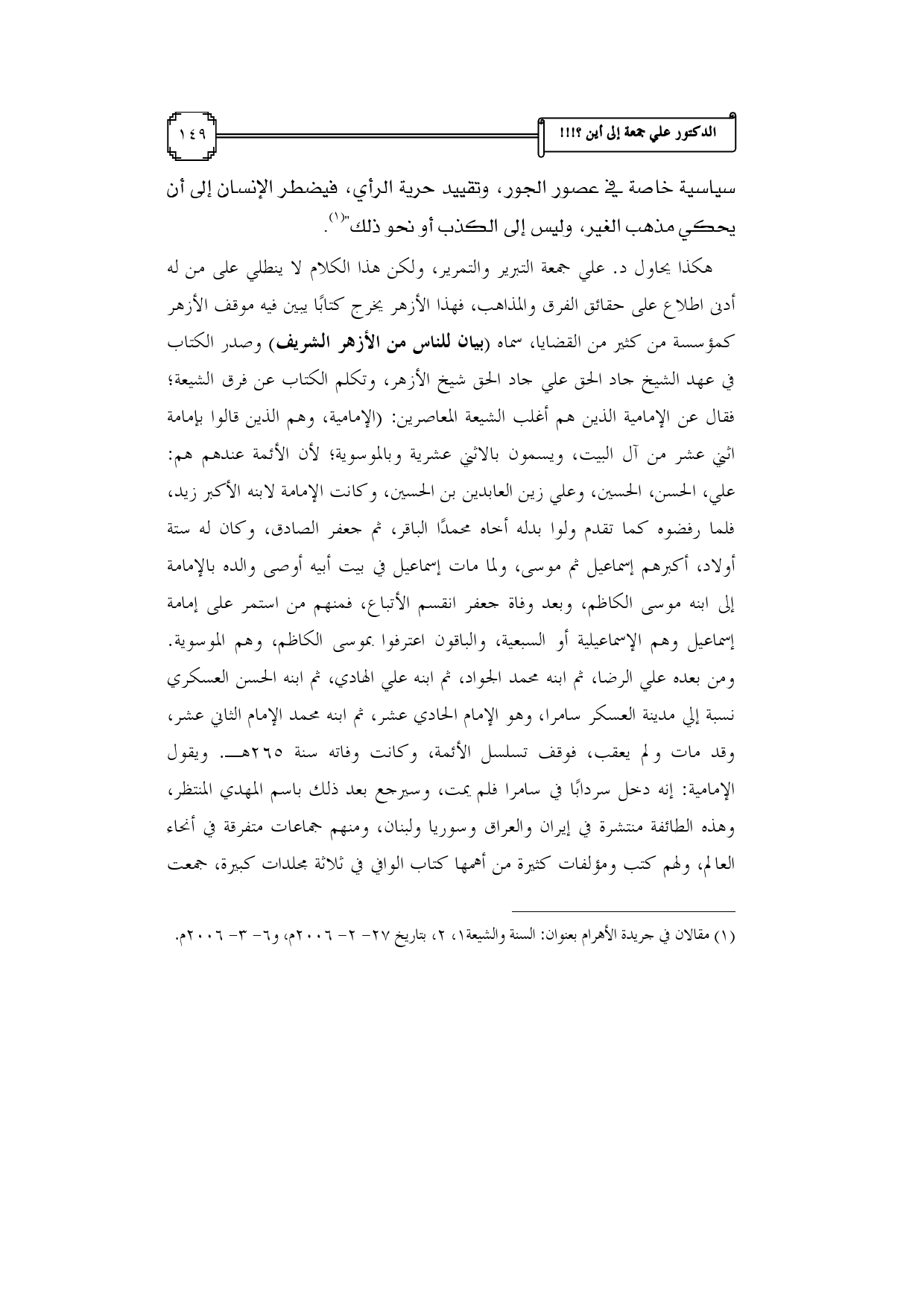 هكذا يحاول د. علي جمعة التبرير والتمرير، ولكن هذا الكلام لا ينطلي على من له أدنى اطلاع على حقائق الفرق والمذاهب، فهذا الأزهر يخرج كتابًا يبين فيه موقف الأزهر كمؤسسة من كثير من القضايا، سماه (بيان للناس من الأزهر الشريف) وصدر الكتاب في عهد الشيخ جاد الحق علي جاد الحق شيخ الأزهر، وتكلم الكتاب عن فرق الشيعة؛ فقال عن الإمامية الذين هم أغلب الشيعة المعاصرين: (الإمامية، وهم الذين قالوا بإمامة اثني عشر من آل البيت، ويسمون بالاثني عشرية وبالموسوية؛ لأن الأئمة عندهم هم: علي، الحسن، الحسين، وعلي زين العابدين بن الحسين، وكانت الإمامة لابنه الأكبر زيد، فلما رفضوه كما تقدم ولوا بدله أخاه محمدًا الباقر، ثم جعفر الصادق، وكان له ستة أولاد، أكبرهم إسماعيل ثم موسى، ولما مات إسماعيل في بيت أبيه أوصى والده بالإمامة إلى ابنه موسى الكاظم، وبعد وفاة جعفر انقسم الأتباع، فمنهم من استمر على إمامة إسماعيل وهم الإسماعيلية أو السبعية، والباقون اعترفوا بموسى الكاظم، وهم الموسوية. ومن بعده علي الرضا، ثم ابنه محمد الجواد، ثم ابنه علي الهادي، ثم ابنه الحسن العسكري نسبة إلي مدينة العسكر سامرا، وهو الإمام الحادي عشر، ثم ابنه محمد الإمام الثاني عشر، وقد مات ولم يعقب، فوقف تسلسل الأئمة، وكانت وفاته سنة 265هـ. ويقول الإمامية: إنه دخل سردابًا في سامرا فلم يمت، وسيرجع بعد ذلك باسم المهدي المنتظر، وهذه الطائفة منتشرة في إيران والعراق وسوريا ولبنان، ومنهم جماعات متفرقة في أنحاء العالم، ولهم كتب ومؤلفات كثيرة من أهمها كتاب الوافي في ثلاثة مجلدات كبيرة، جمعت