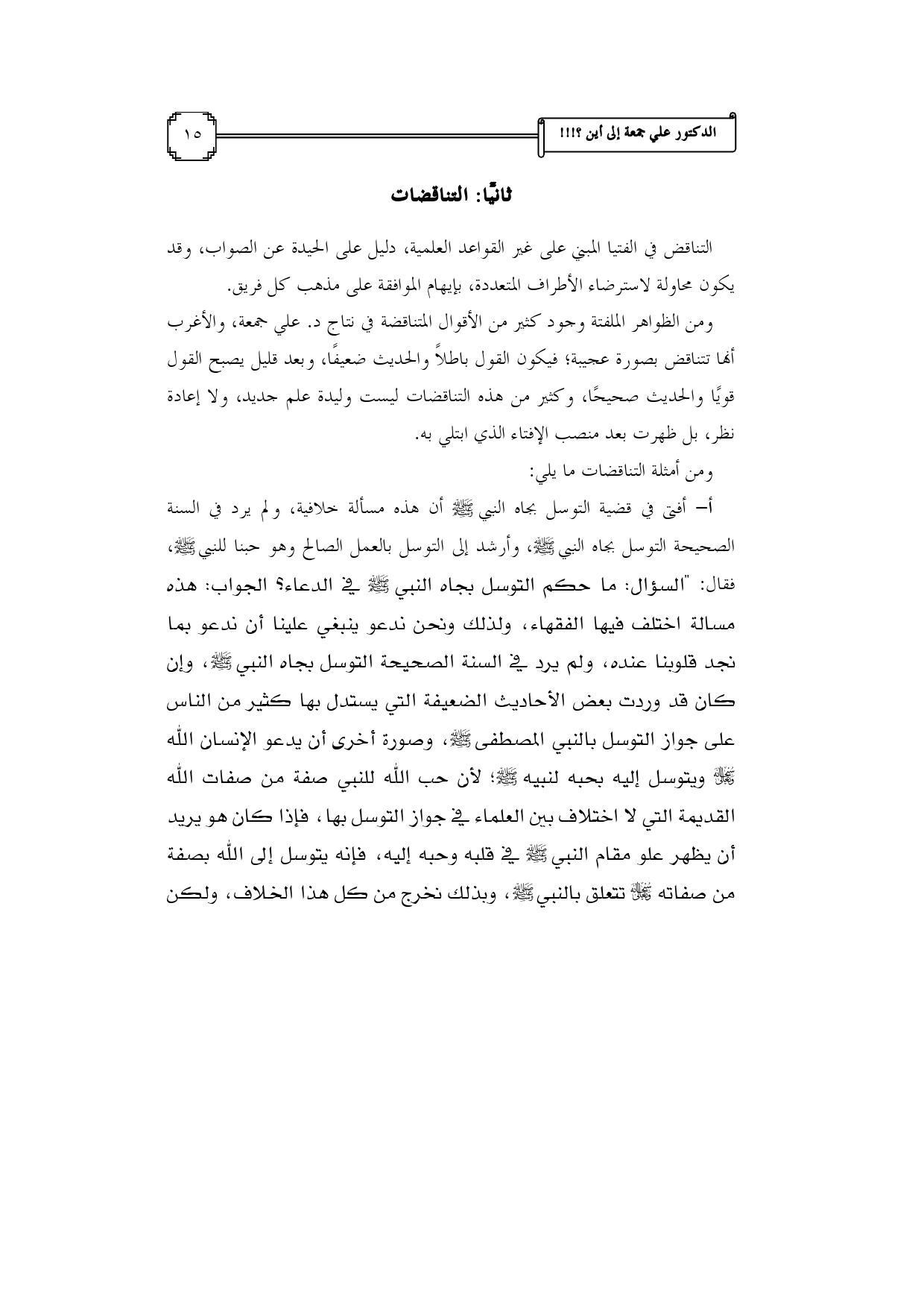 ومن الظواهر الملفتة وجود كثير من الأقوال المتناقضة في نتاج د. علي جمعة، والأغرب أنها تتناقض بصورة عجيبة؛ فيكون القول باطلاً والحديث ضعيفًا، وبعد قليل يصبح القول قويًا والحديث صحيحًا، وكثير من هذه التناقضات ليست وليدة علم جديد، ولا إعادة نظر، بل ظهرت بعد منصب الإفتاء الذي ابتلي به.