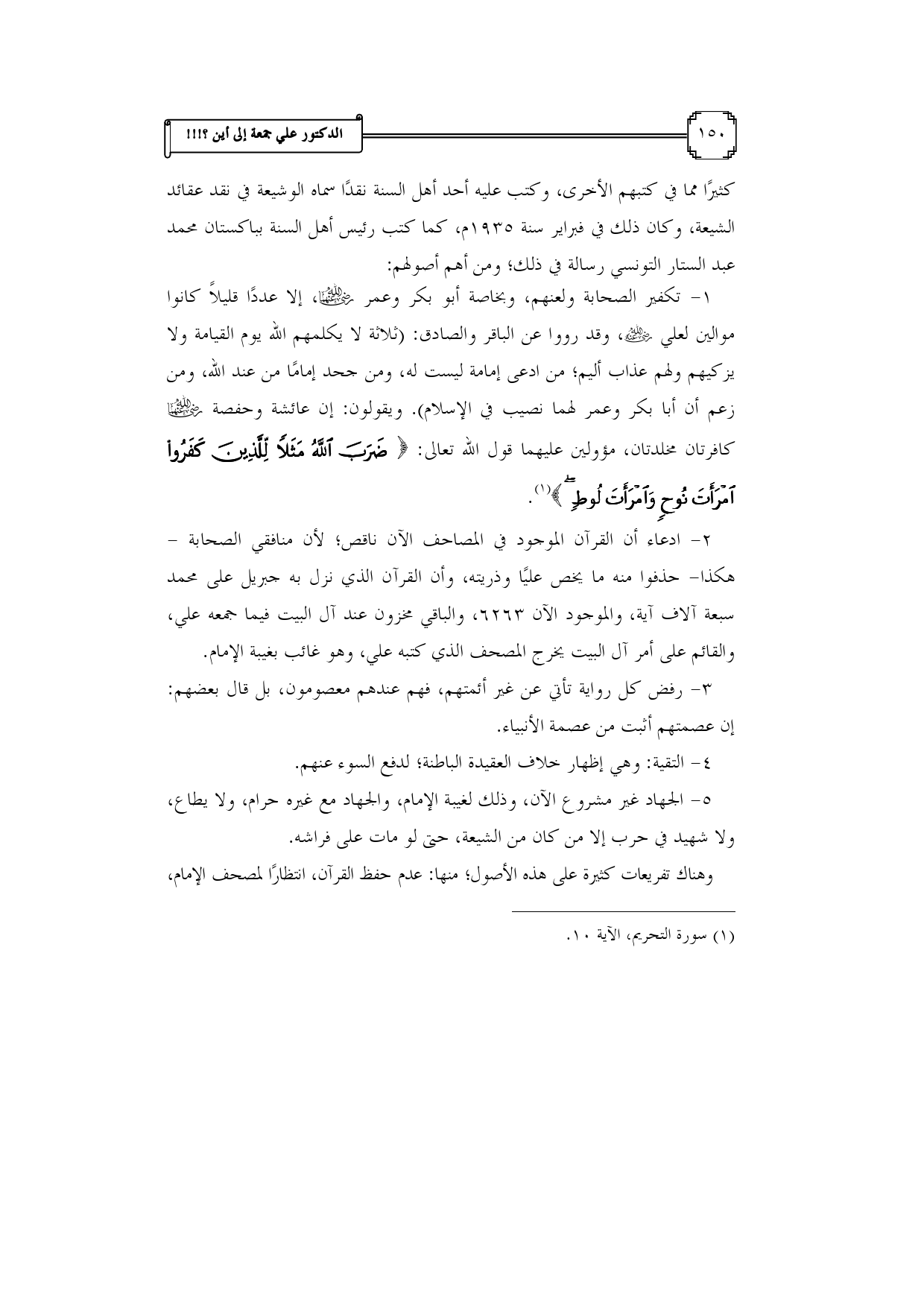 كثيرًا مما في كتبهم الأخرى، وكتب عليه أحد أهل السنة نقدًا سماه الوشيعة في نقد عقائد الشيعة، وكان ذلك في فبراير سنة 1935م، كما كتب رئيس أهل السنة بباكستان محمد عبد الستار التونسي رسالة في ذلك؛ ومن أهم أصولهم: