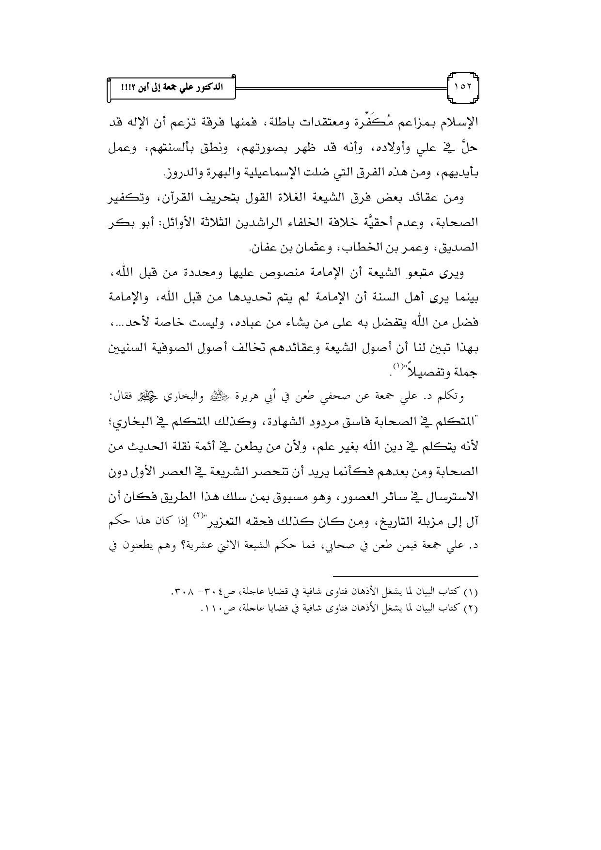 وتكلم د. علي جمعة عن صحفي طعن في أبي هريرة رضي الله عنه والبخاري رحمه الله فقال: "المتكلم في الصحابة فاسق مردود الشهادة، وكذلك المتكلم في البخاري؛ لأنه يتكلم في دين الله بغير علم، ولأن من يطعن في أئمة نقلة الحديث من الصحابة ومن بعدهم فكأنما يريد أن تنحصر الشريعة في العصر الأول دون الاسترسال في سائر العصور، وهو مسبوق بمن سلك هذا الطريق فكان أن آل إلى مزبلة التاريخ، ومن كان كذلك فحقه التعزير" (¬2) إذا كان هذا حكم د. علي جمعة فيمن طعن في صحابي، فما حكم الشيعة الاثني عشرية؟ وهم يطعنون في
