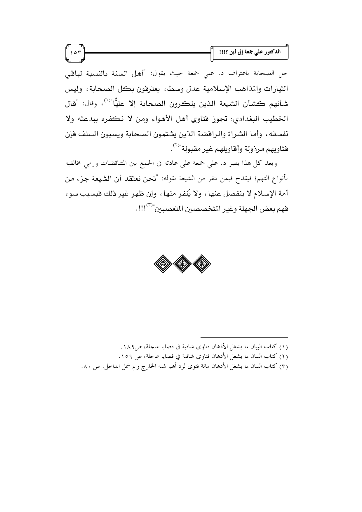 جل الصحابة باعتراف د. علي جمعة حيث يقول: "أهل السنة بالنسبة لباقي التيارات والمذاهب الإسلامية عدل وسط، يعترفون بكل الصحابة، وليس شأنهم كشأن الشيعة الذين ينكرون الصحابة إلا عليًّا" (¬1)، وقال: "قال الخطيب البغدادي: تجوز فتاوى أهل الأهواء ومن لا نكفره ببدعته ولا نفسقه، وأما الشراة والرافضة الذين يشتمون الصحابة ويسبون السلف فإن فتاويهم مرذولة وأقاويلهم غير مقبولة" (¬2).