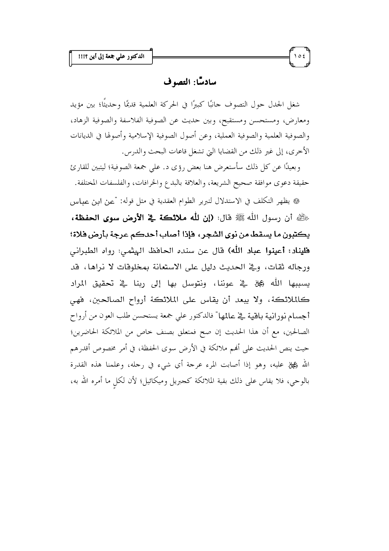* يظهر التكلف في الاستدلال لتبرير الطوام العقدية في مثل قوله: "عن ابن عباس رضي الله عنه أن رسول الله صلى الله عليه وسلم قال: (إن لله ملائكة في الأرض سوى الحفظة، يكتبون ما يسقط من نوى الشجر، فإذا أصاب أحدكم عرجة بأرض فلاة؛ فليناد: أعينوا عباد الله) قال عن سنده الحافظ الهيثمي: رواه الطبراني ورجاله ثقات، وفي الحديث دليل على الاستعانة بمخلوقات لا نراها، قد يسببها الله عز وجل في عوننا، ونتوسل بها إلى ربنا في تحقيق المراد كالملائكة، ولا يبعد أن يقاس على الملائكة أرواح الصالحين، فهي أجسام نورانية باقية في عالمها" فالدكتور علي جمعة يستحسن طلب العون من أرواح الصالحين، مع أن هذا الحديث إن صح فمتعلق بصنف خاص من الملائكة الحاضرين؛ حيث ينص الحديث على أنهم ملائكة في الأرض سوى الحفظة، في أمر مخصوص أقدرهم الله عز وجل عليه، وهو إذا أصابت المرء عرجة أي شيء في رجله، وعلمنا هذه القدرة بالوحي، فلا يقاس على ذلك بقية الملائكة كجبريل وميكائيل؛ لأن لكلٍ ما أمره الله به،